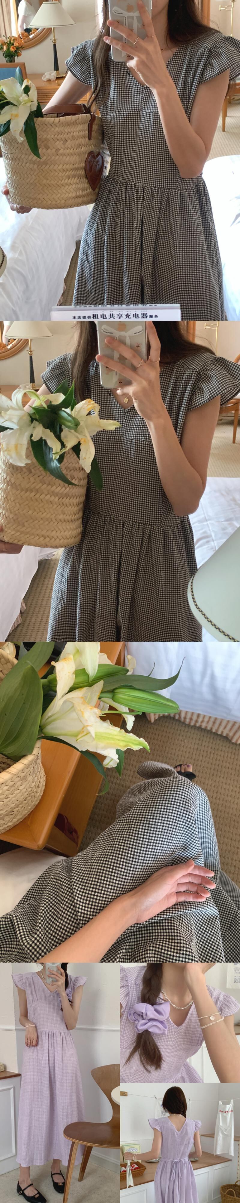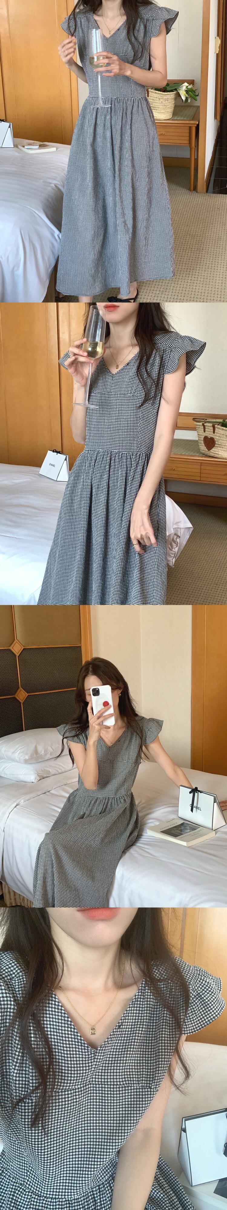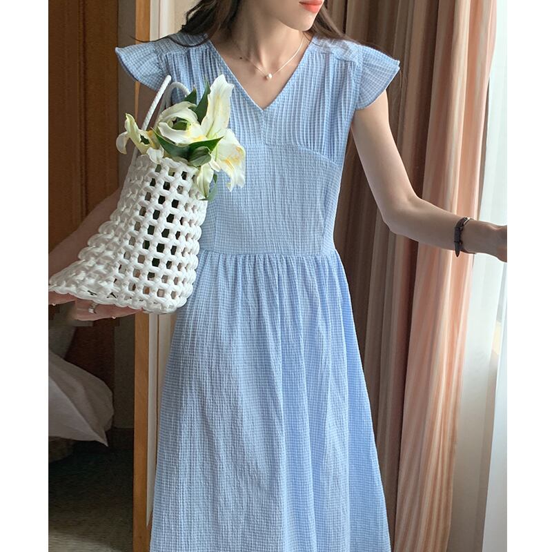 サマーVネックプリーツウェスト薄手ロング格子柄ドレス エレガント 夏物 7/20 mi4696435861369