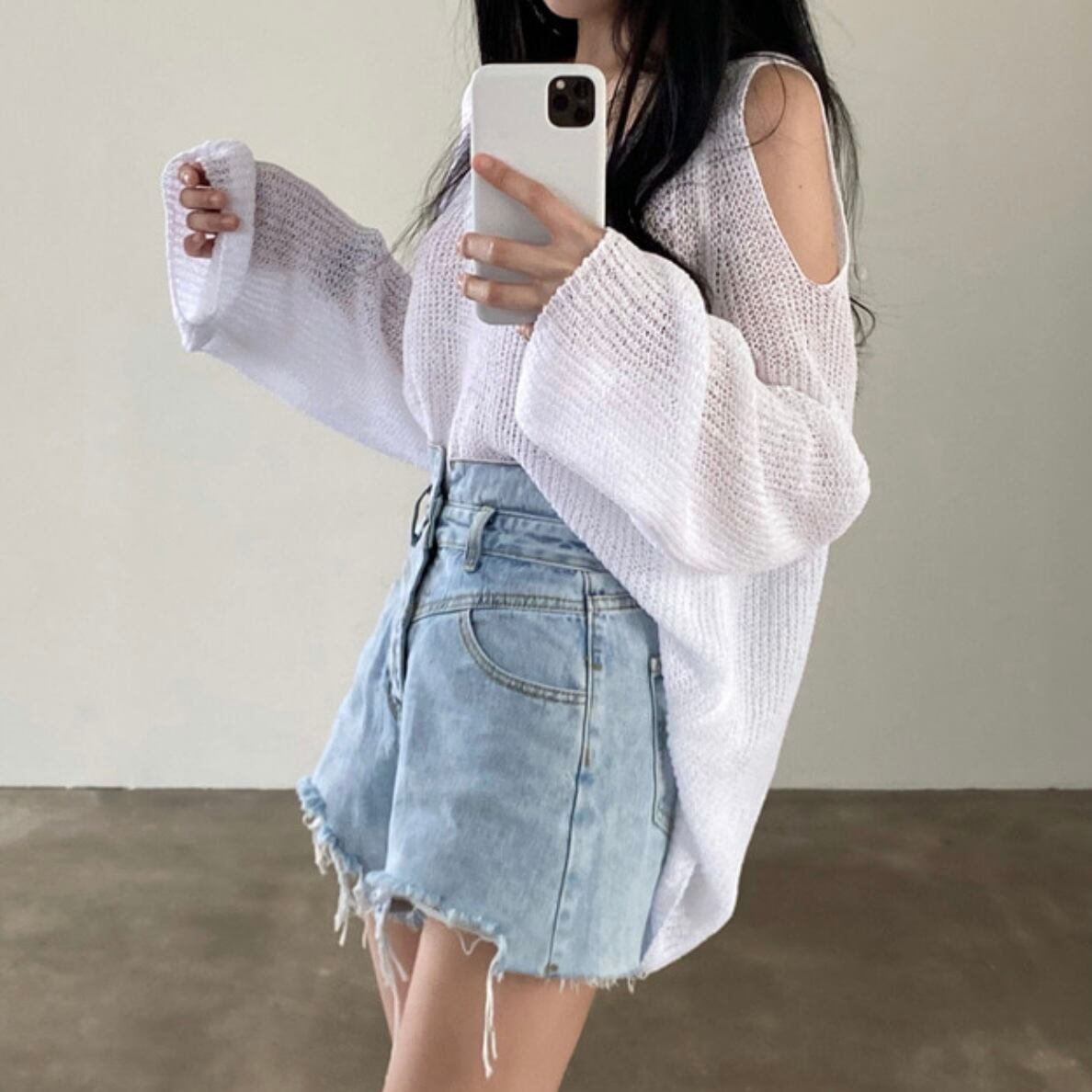 サマーVネックルーズカジュアルソリッド カラーセーター 夏物 ソリッドカラー 7/20 mi4692618866640