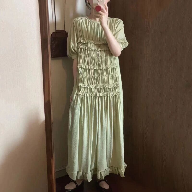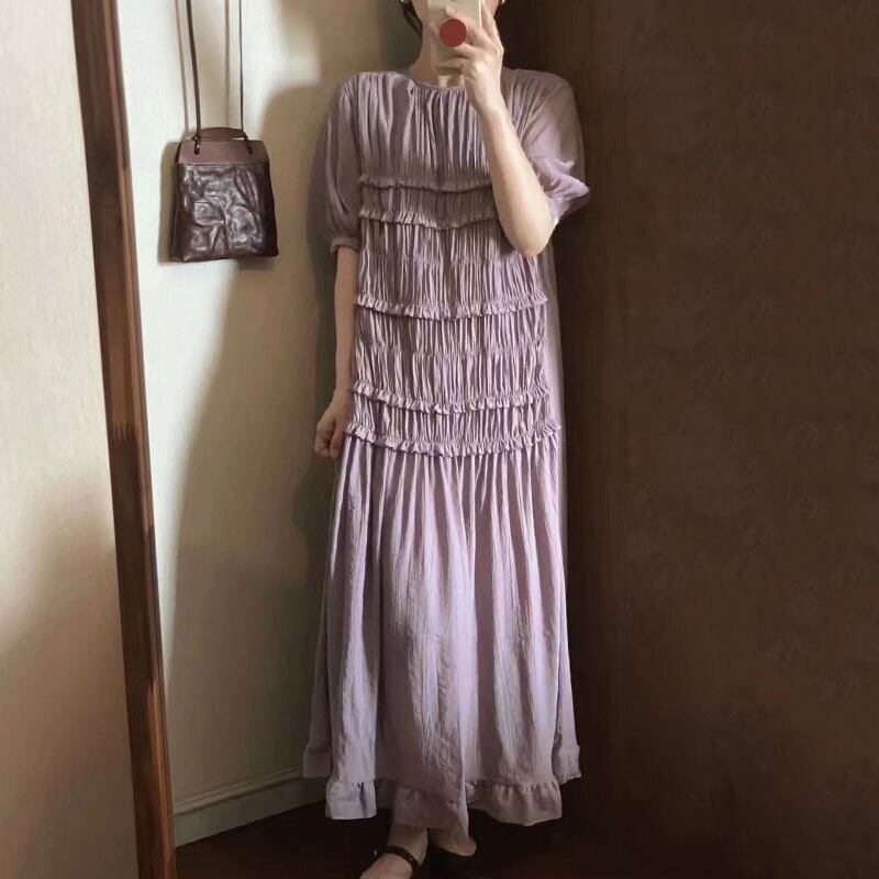 サマースタンダードラウンドネックプリーツスリーブドレス ロングスカート レトロ 夏物 Oネック ステッチ 7/20 mi4634744681796