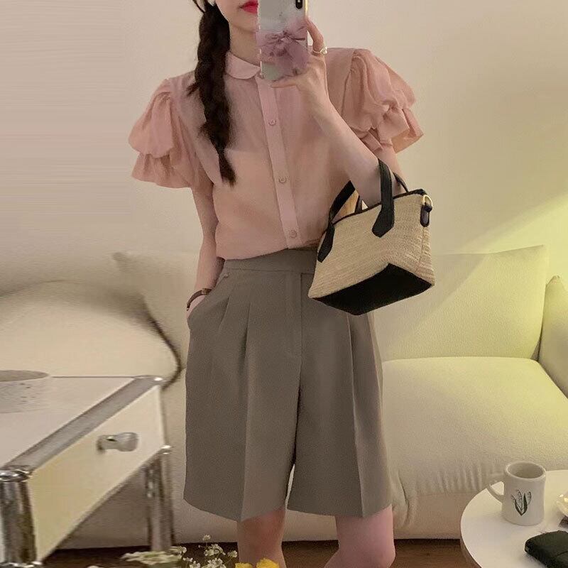 サマーカラープリーツスリーブシャツ ハイウェストウェストパンツ ピンク 夏物 7/20 mi4664617063456