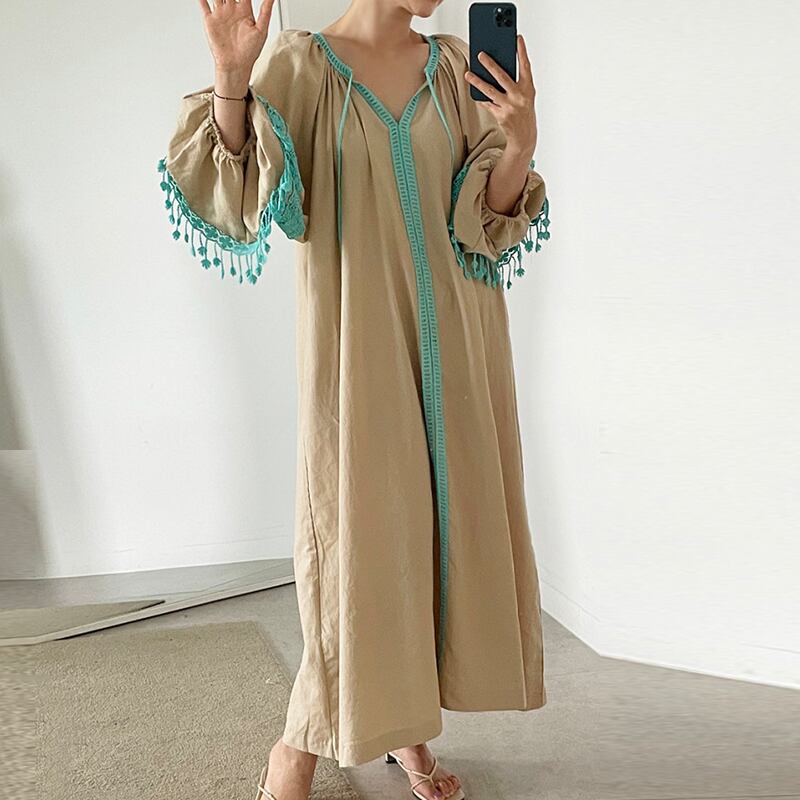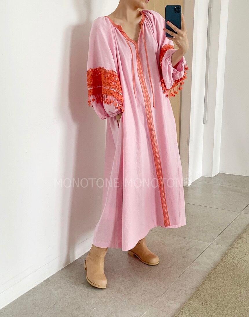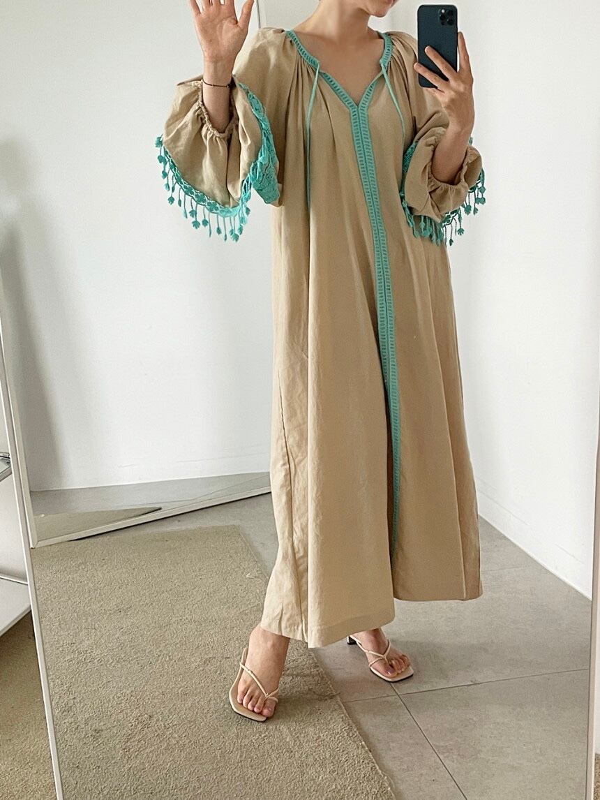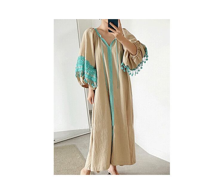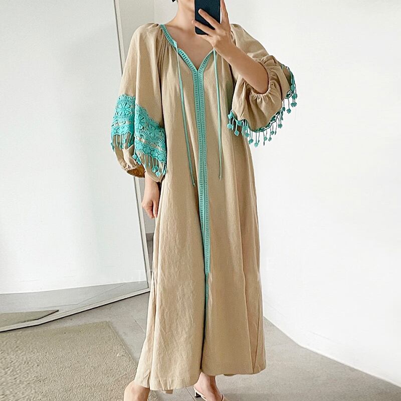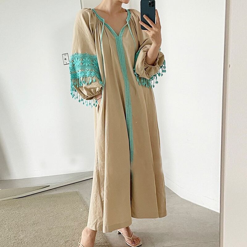 サマースタンダードラウンドネックカラーレーススリーブドレス ランタンスリーブ レトロ 夏物 Oネック ステッチ 7/20 mi4622544025275