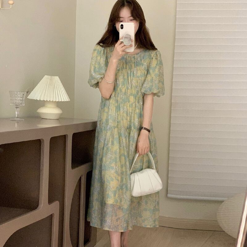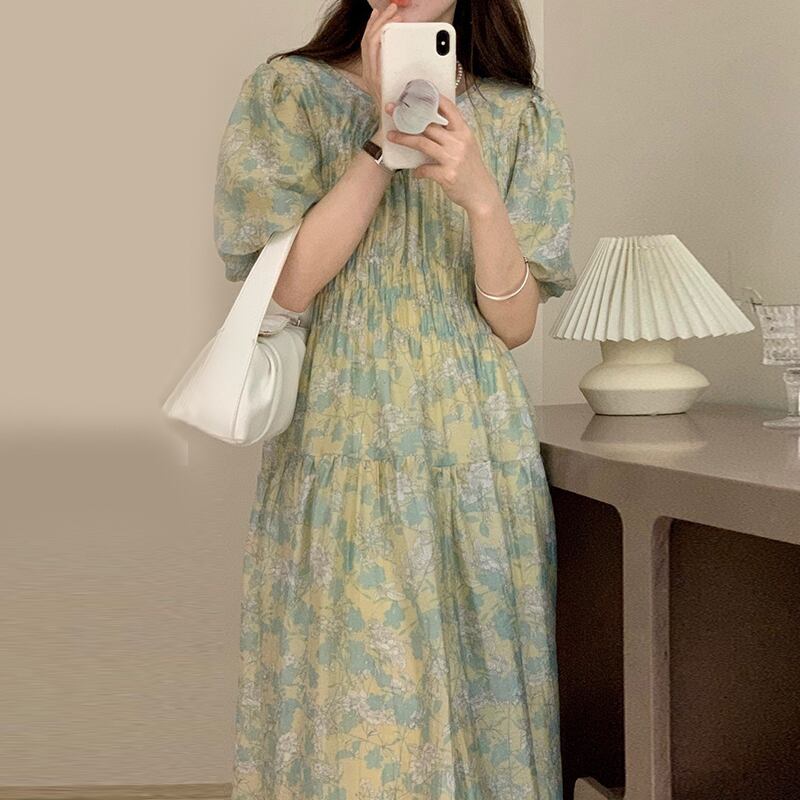 サマーラウンドネックフローラルウェストスリーブロングドレス レディース 夏物 花柄 Oネック 7/20 mi4643191854933