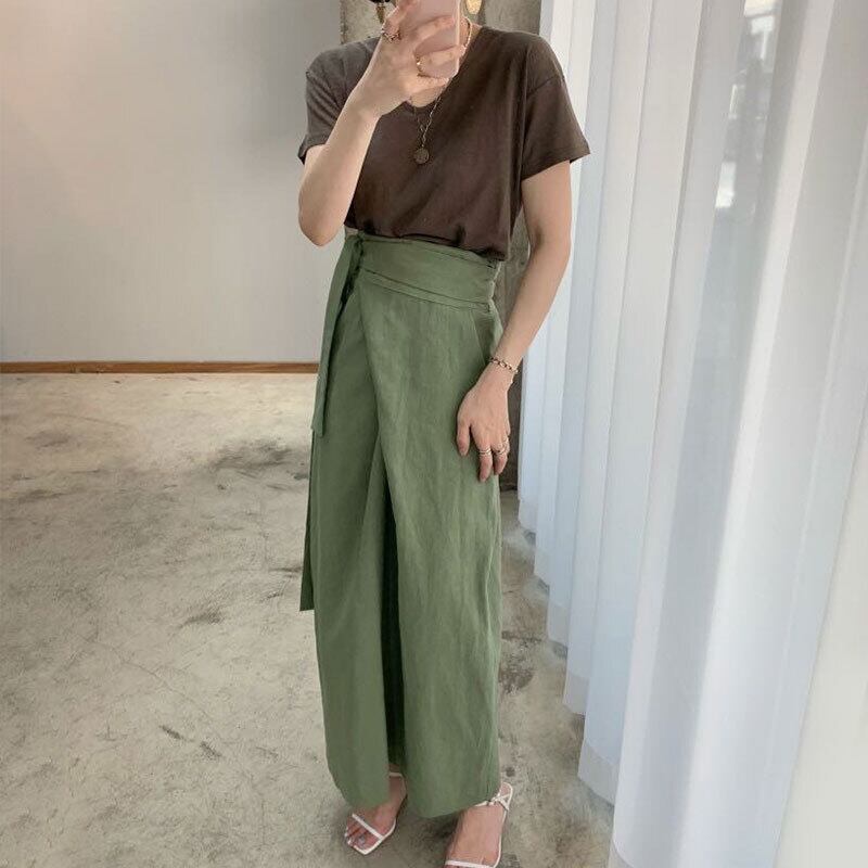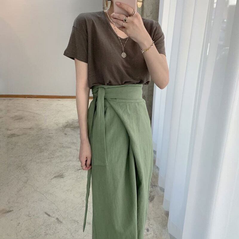 サマーラウンドネックソリッド カラーTシャツ ハイウェストウェストストラップ 夏物 Oネック ソリッドカラー 7/20 mi465768537130