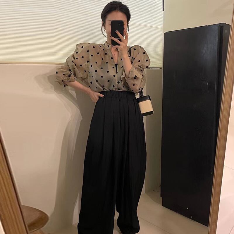 サマースタンドカラーカラーメッシュ水玉シャツ ハイウェストウェストプリーツルーズワイドレッグレディース 夏物 ワイドパンツ 7/20 mi4694582861159