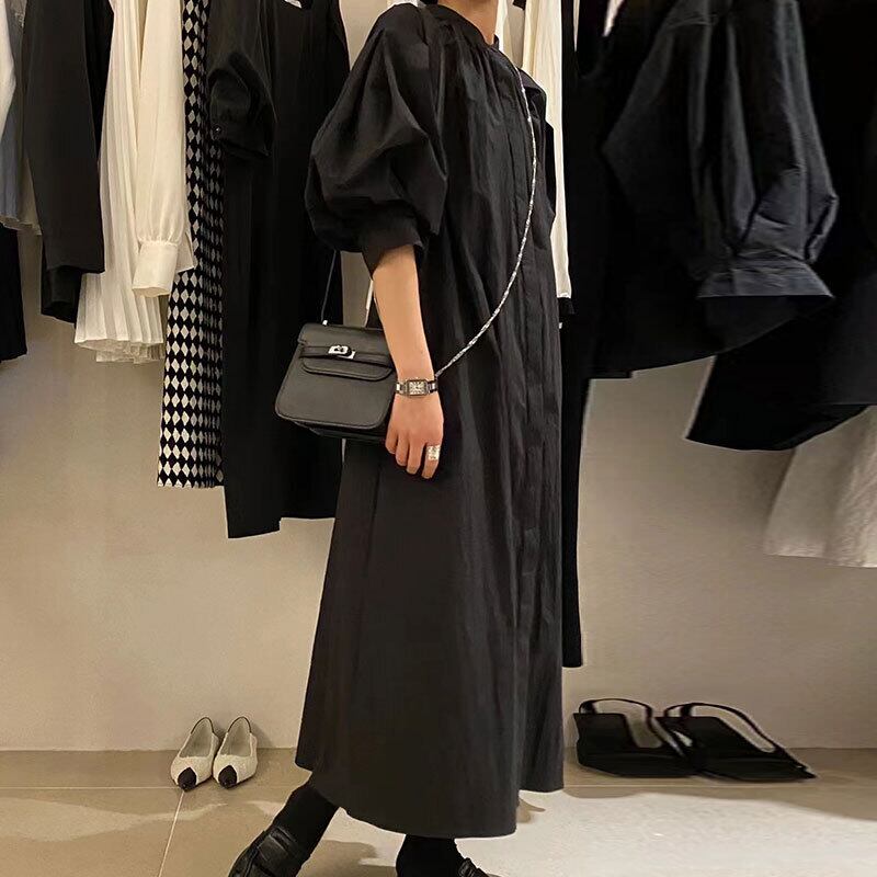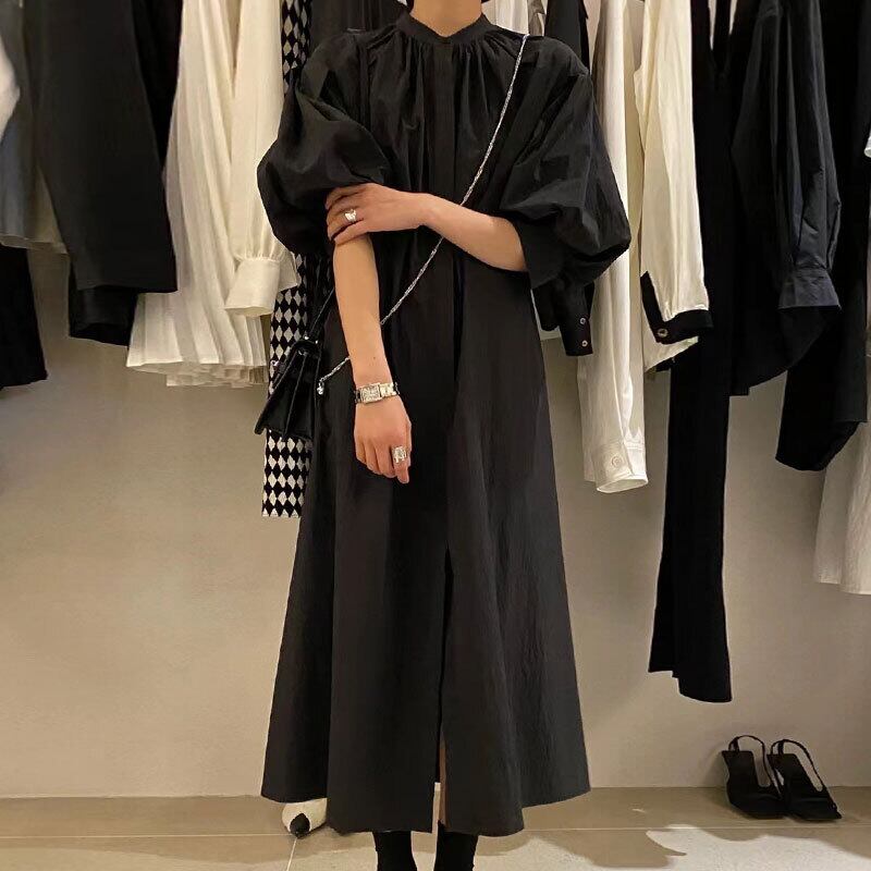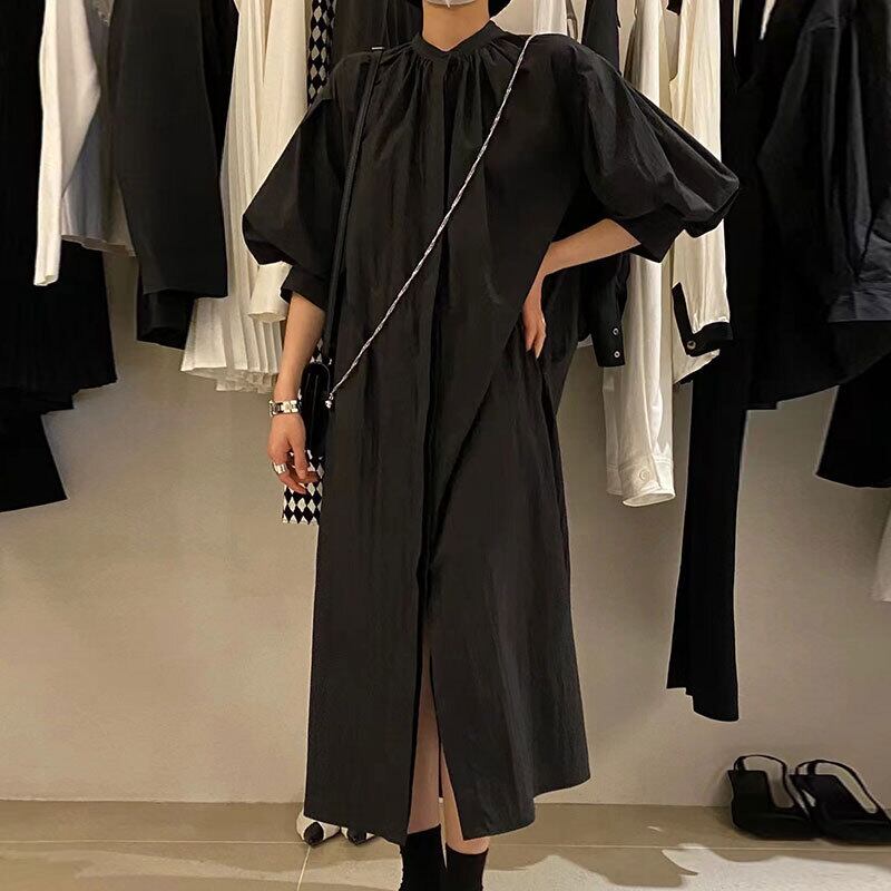 サマースタンダードスタンドカラーカラーボタンルーズカジュアルスリーブスリットドレス ランタンスリーブ レトロ 夏物 7/20 mi4698268069059