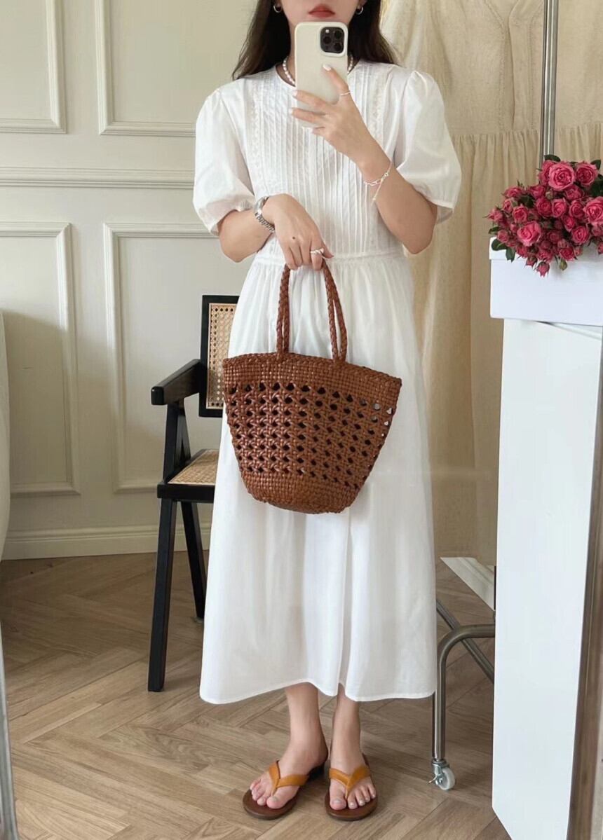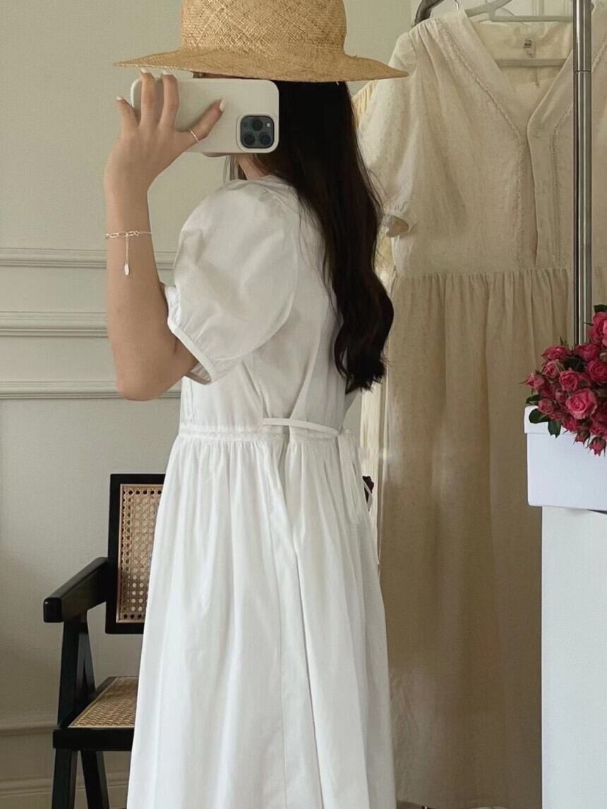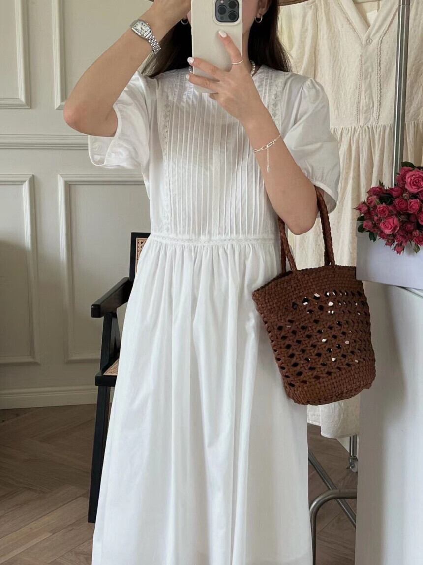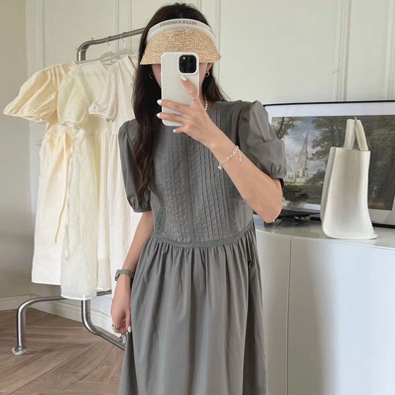 サマーラウンドネックプリーツウェスト薄手ロングスリーブドレス エレガント 夏物 Oネック 7/20 mi4655334655184