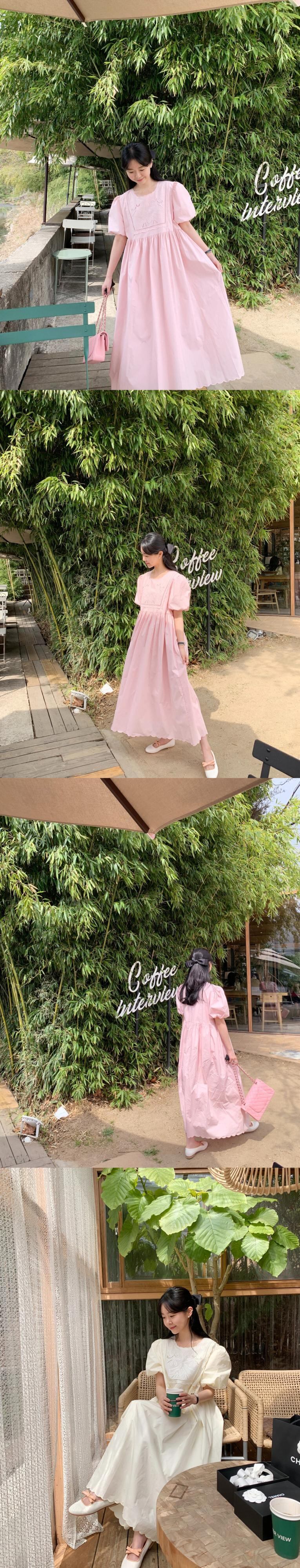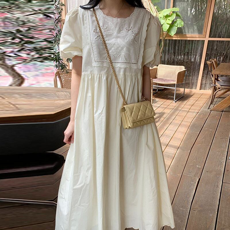 サマーカラーレースFlowerデザイン ルーズカジュアルスリーブドレス ロングスカート 夏物 フラワーデザイン スクウェア ステッチ 7/20 mi4694705404642