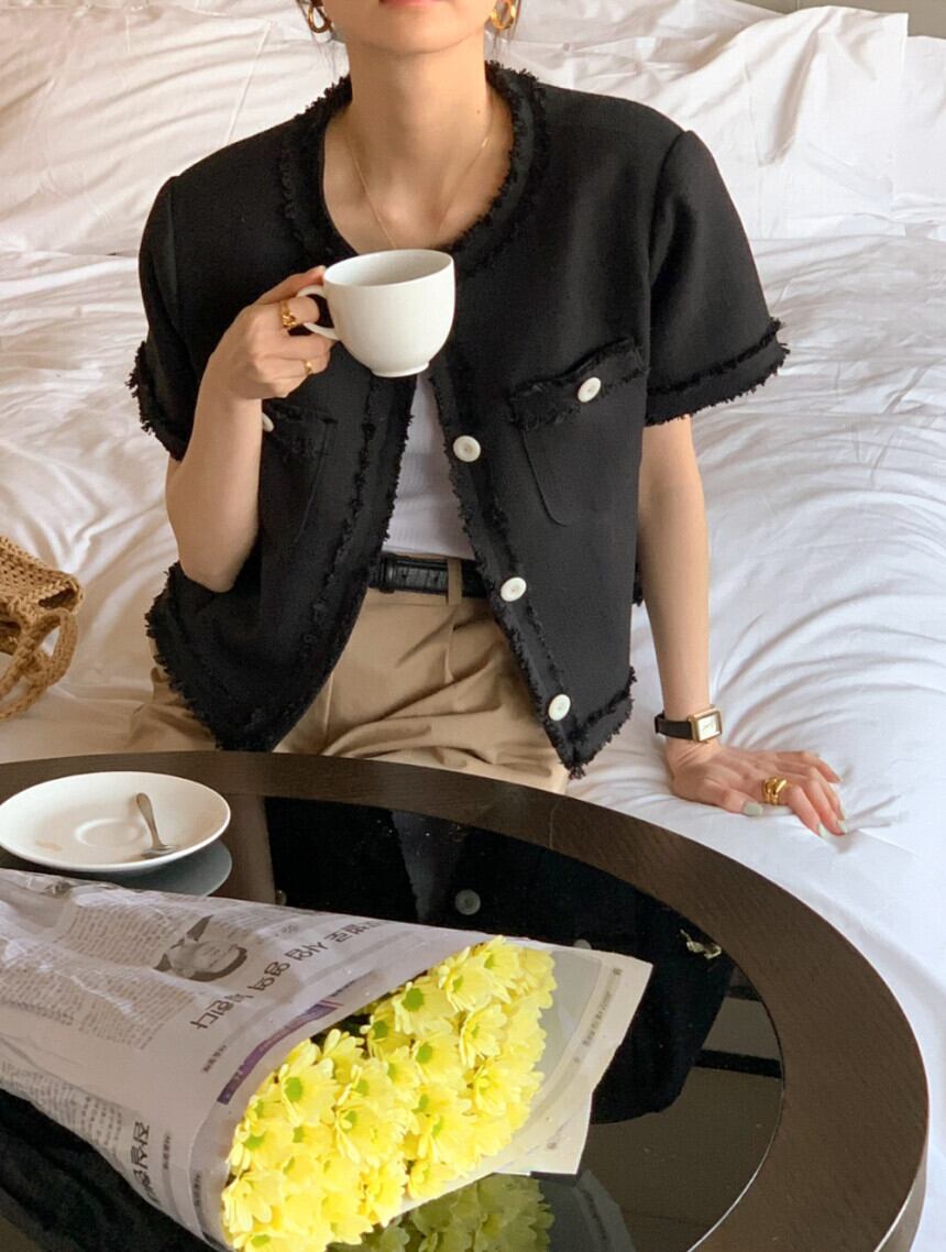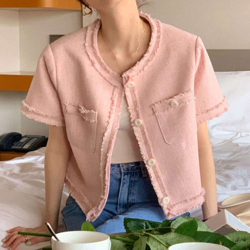 サマーラウンドネックツィードショートコート トップス ピンク 夏物 Oネック 7/20 mi4632088653293