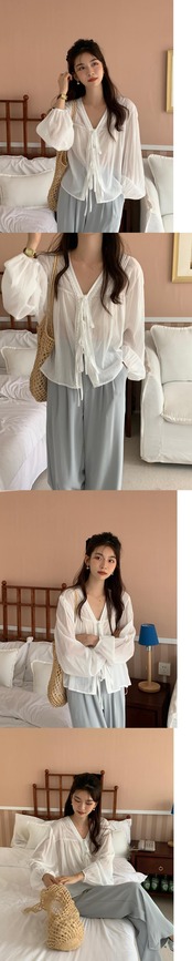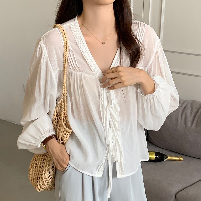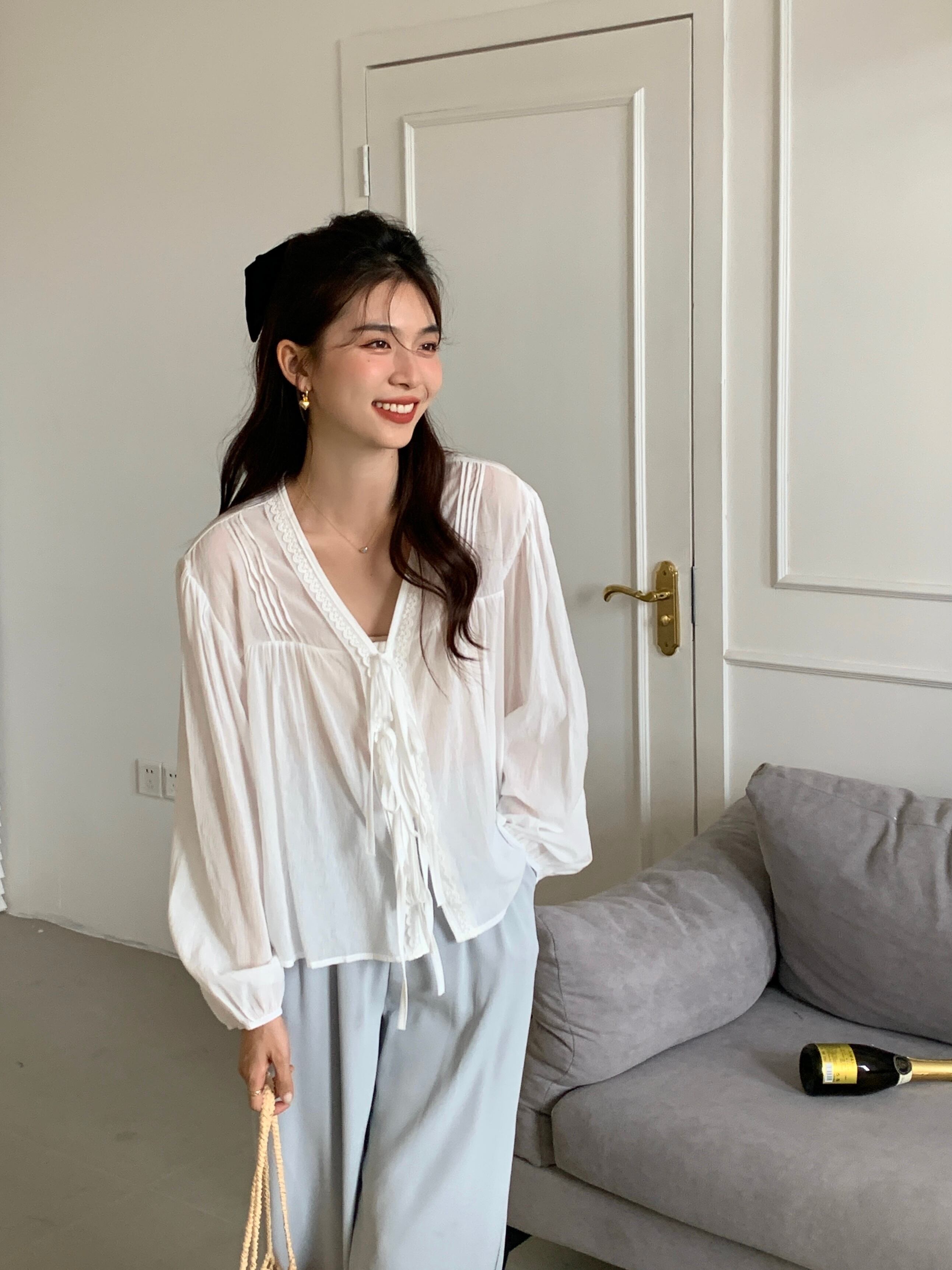 サマーVネックレースルーズ薄手シャツ ロング 夏物 ステッチ 7/20 mi4632996115504