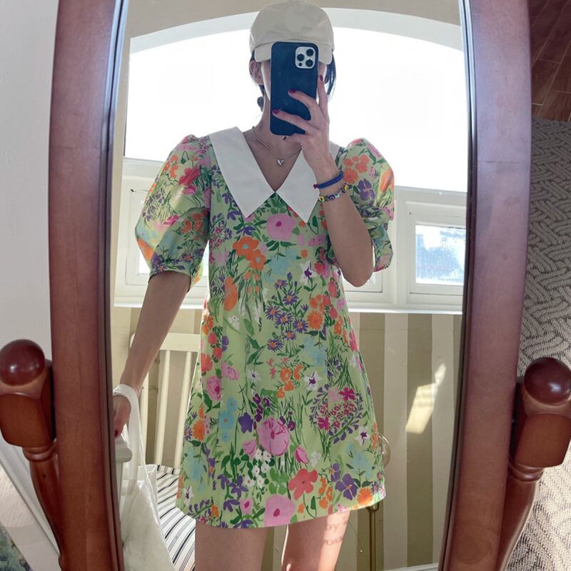 サマーカラーFlowerデザイン ウェスト薄手スリーブドレス 夏物 フラワーデザイン 7/20 mi468003370099