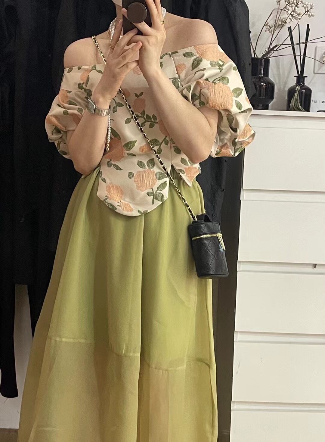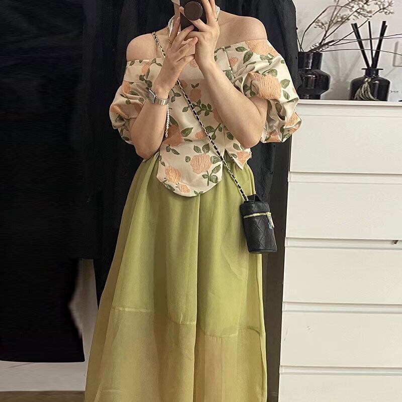 色:ブルーフラワーブラウス,アプリコットフラワートップ,白いスカート,緑のスカート