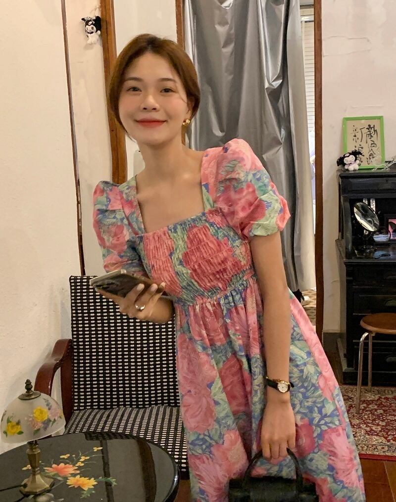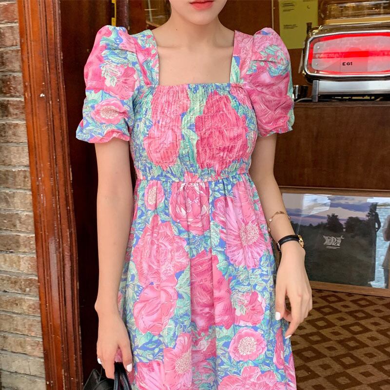 サマーカラーウェストフローラルプリント柄ドレス ロングスカート 大人ガーリー スウィート キュート カジュアル 夏物 花柄 スクウェア 7/20 mi4610143868985