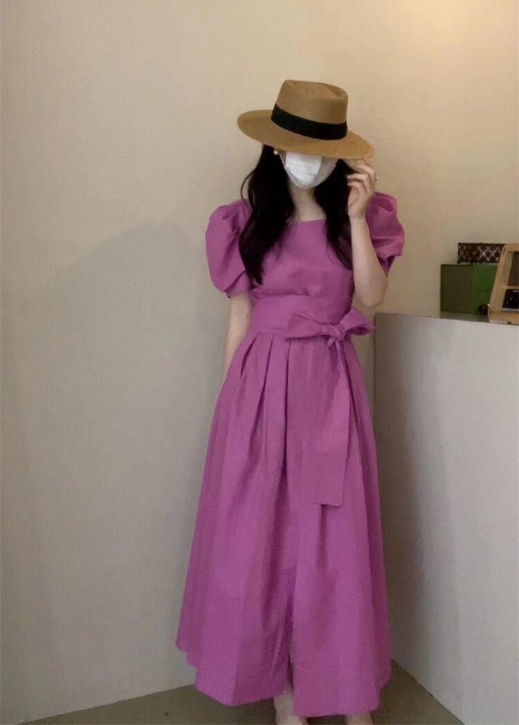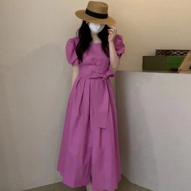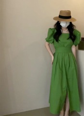 サマースタンダードカラーリボンウェストスリーブスリットドレス レトロ 夏物 スクウェア 7/20 mi4617297529393