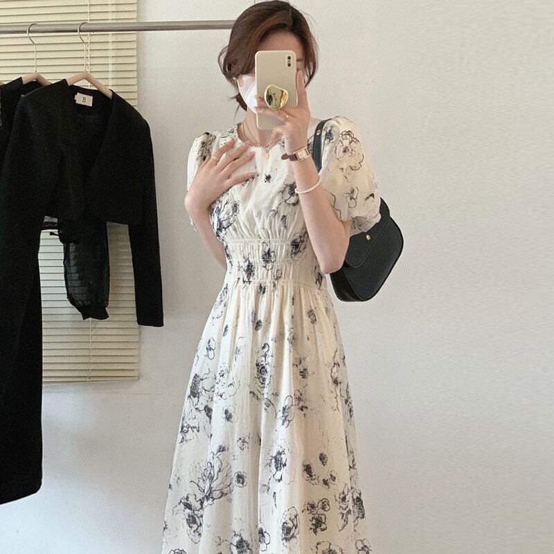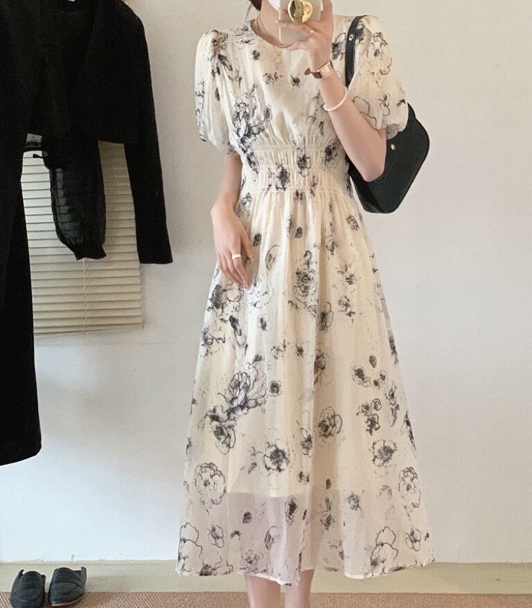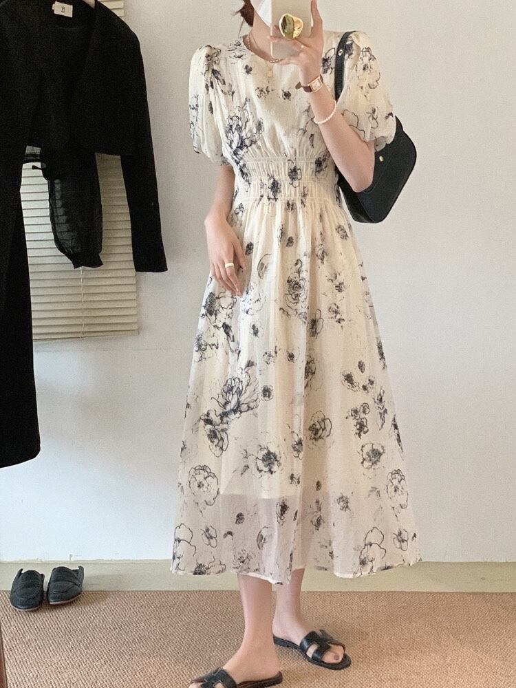 サマーラウンドネックプリント柄プリーツウェスト薄手ドレス ロングスカート 夏物 Oネック 7/20 mi4610852210838