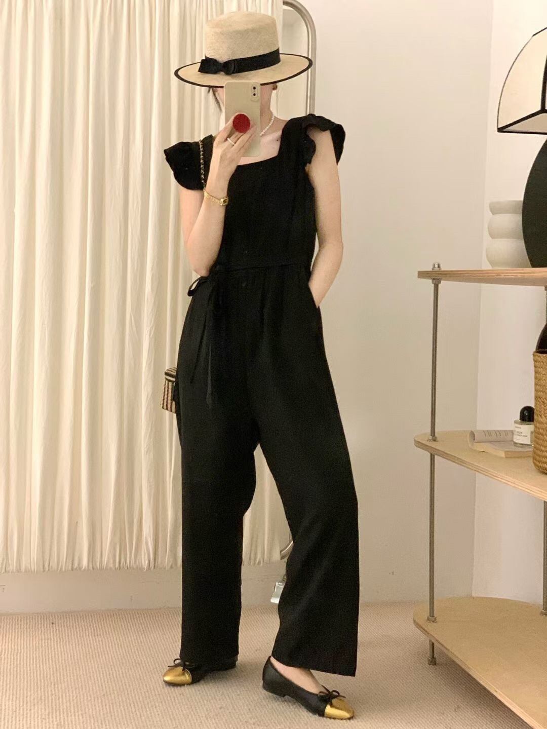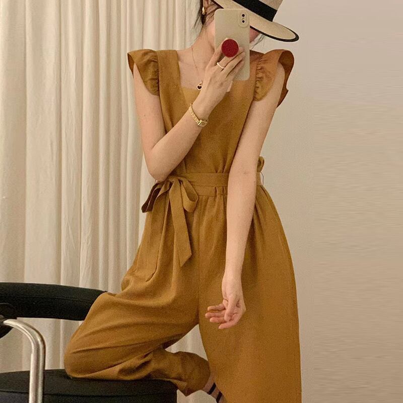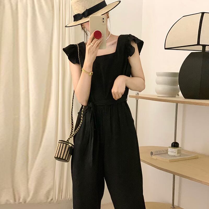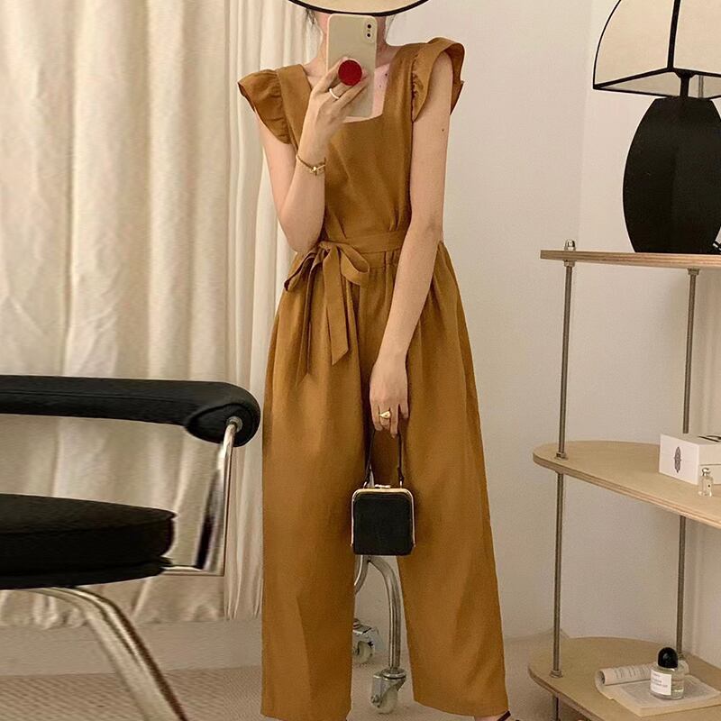 サマースタンダードウェストサイドスリーブワイドレッグジャンプスーツ オールインワン レディース レトロ 夏物 ワイドパンツ スクウェア 7/20 mi4631755728336