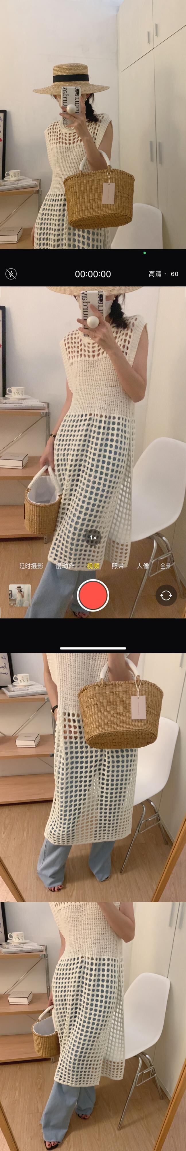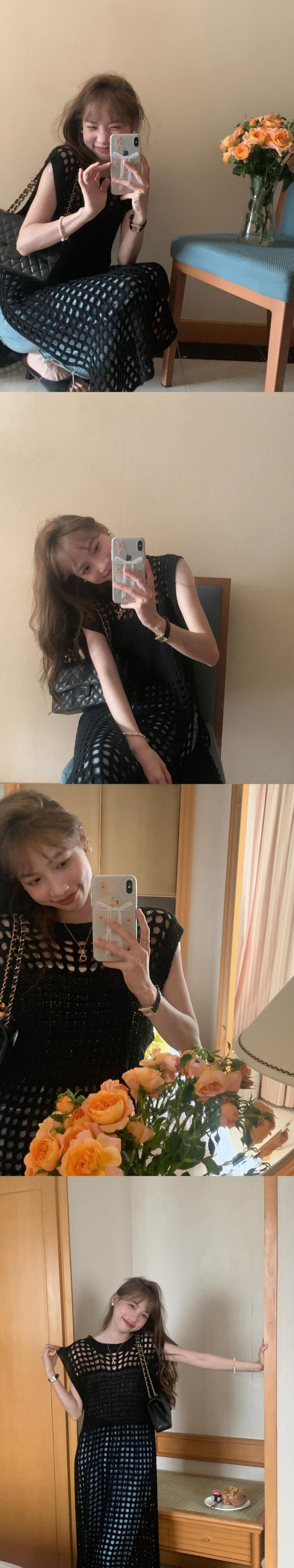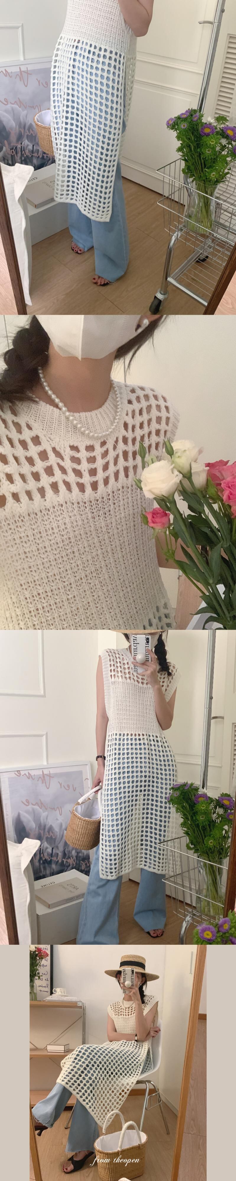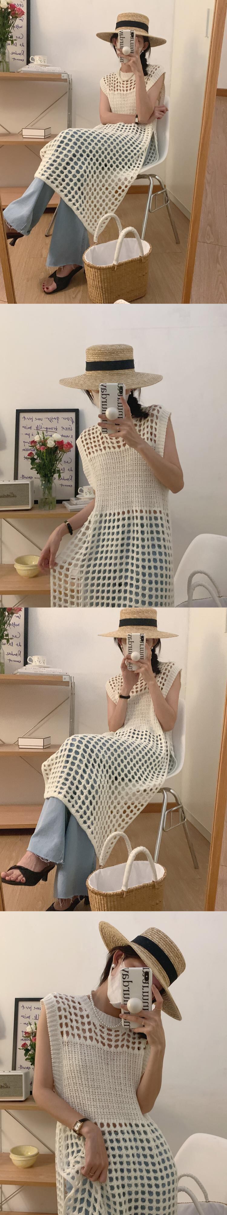 サマースタンダードラウンドネックメッシュサイドスリットノースリーブニットドレス レトロ 夏物 Oネック 7/20 mi4615788688567