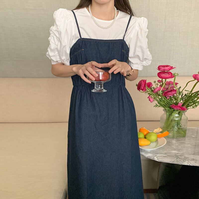 サマーラウンドネックスリーブシャツ スタンダードプリーツドレス レトロ 夏物 Oネック 7/20 mi4672815710541