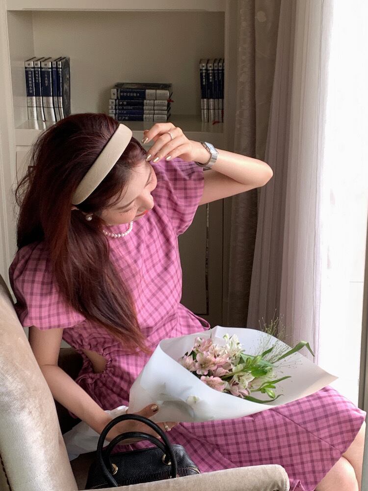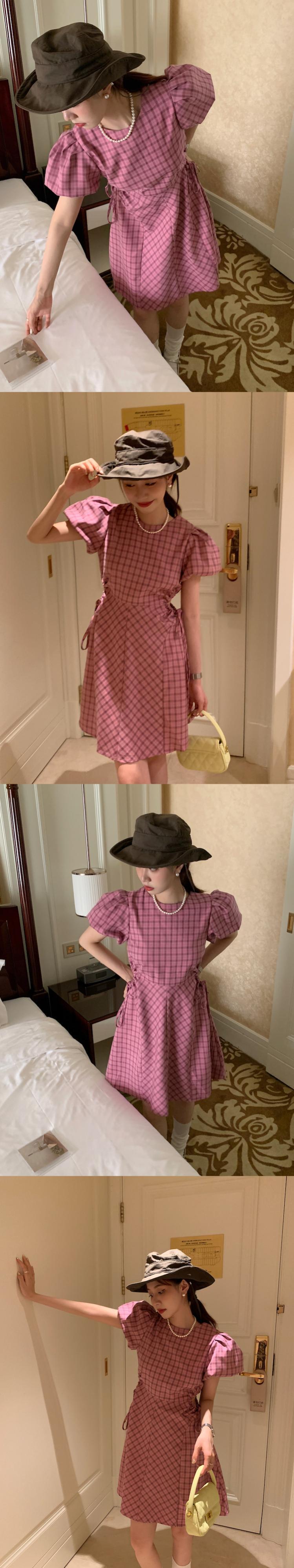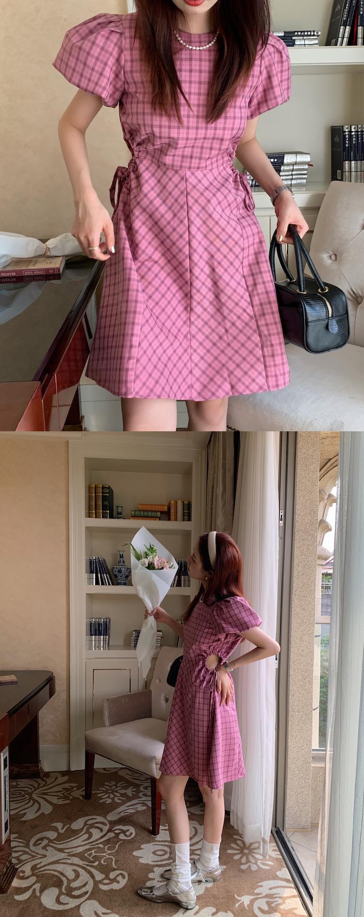 サマーラウンドネックギャザーウェストスリーブ格子柄ドレス 大人ガーリー スウィート キュート カジュアル 夏物 Oネック 7/20 mi4683690998052