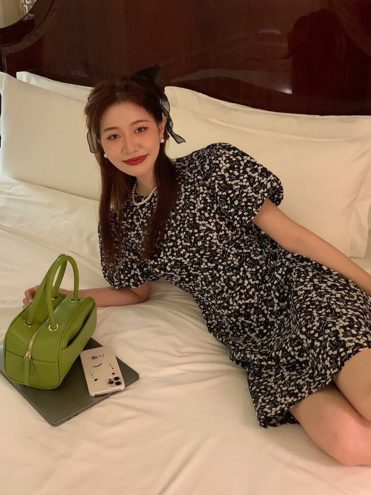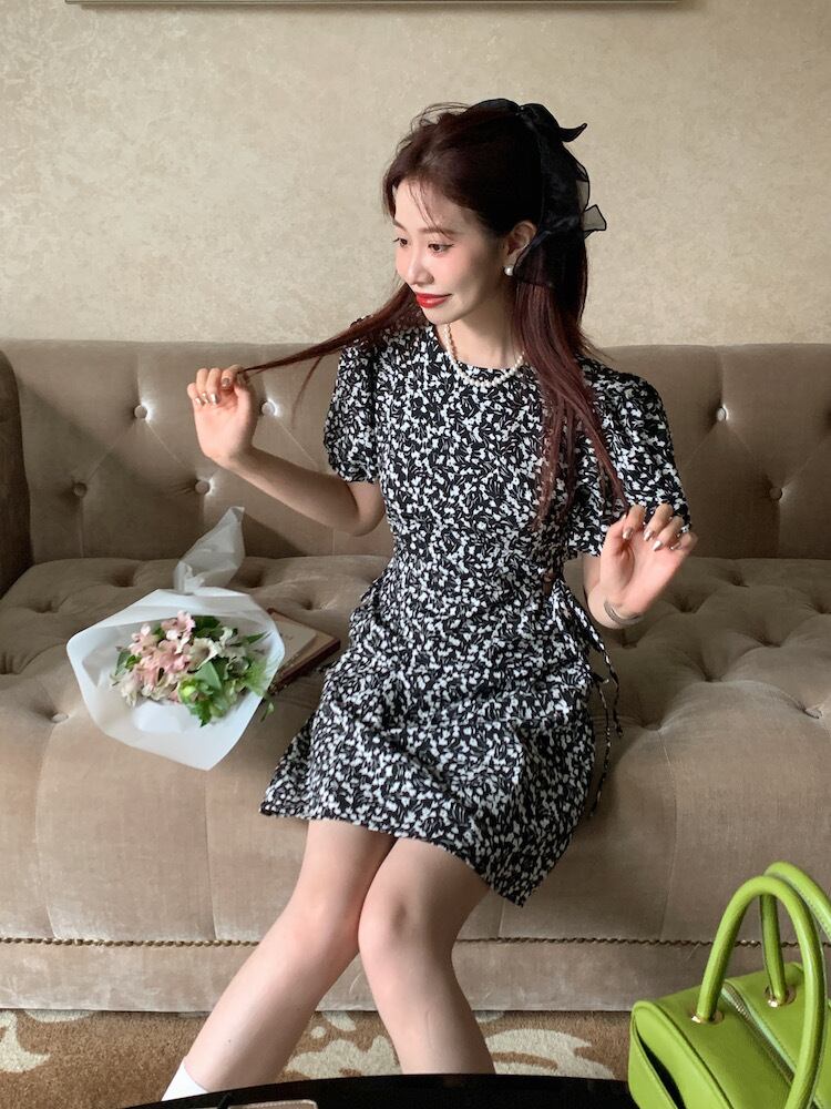 サマースタンダードラウンドネックウェストスリーブフローラルドレス レトロ 夏物 花柄 Oネック 7/20 mi4644676102864