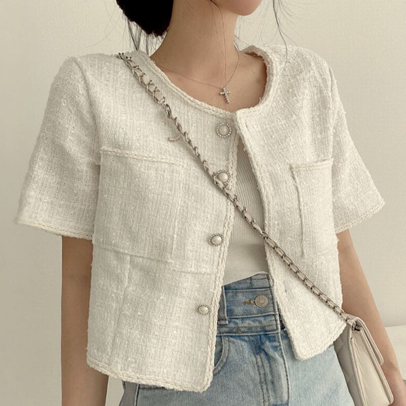 サマーラウンドネックルーズパールツィードショートコート 夏物 Oネック 真珠 7/20 mi4641505665372