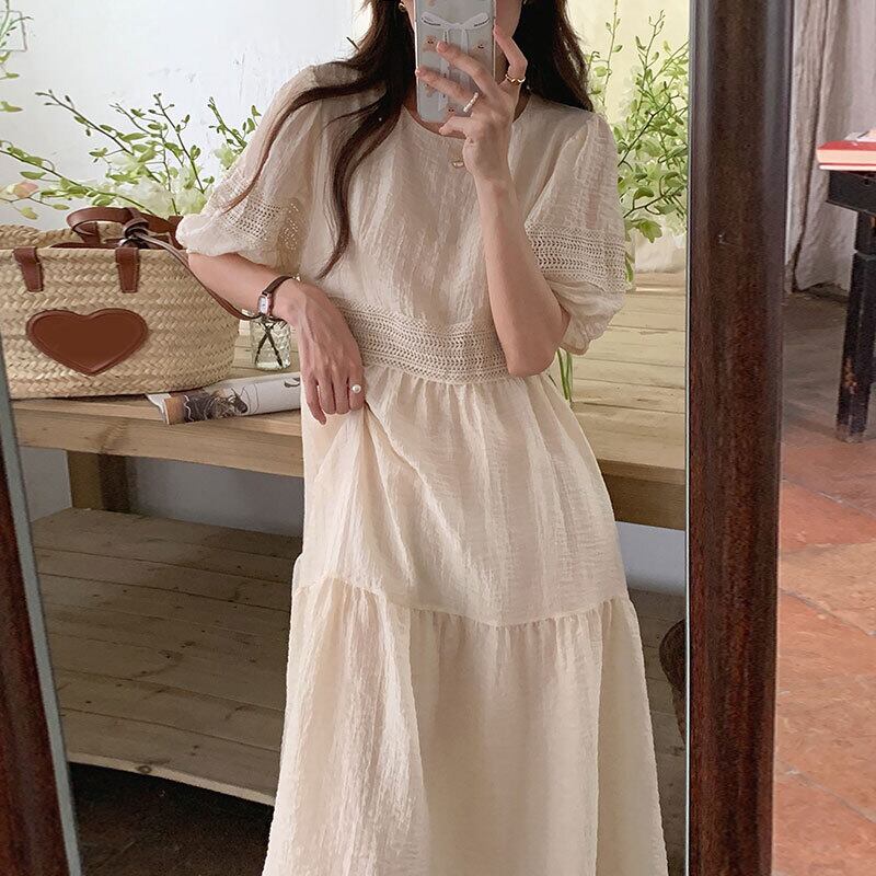 サマーラウンドネックレースFlowerデザイン スリーブドレス レッド 大人ガーリー スウィート キュート カジュアル 夏物 Oネック フラワーデザイン 7/20 mi4656017616845