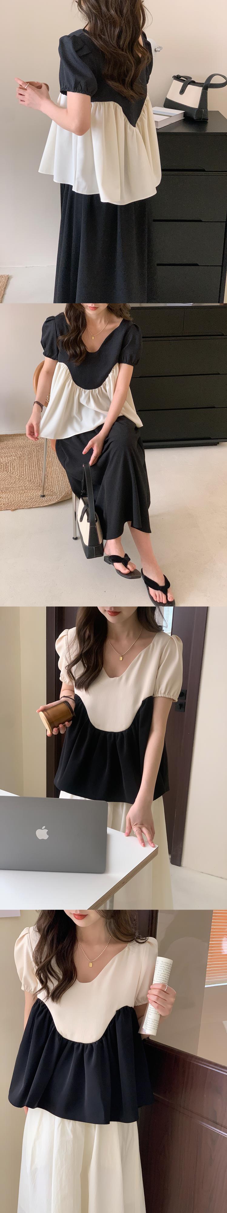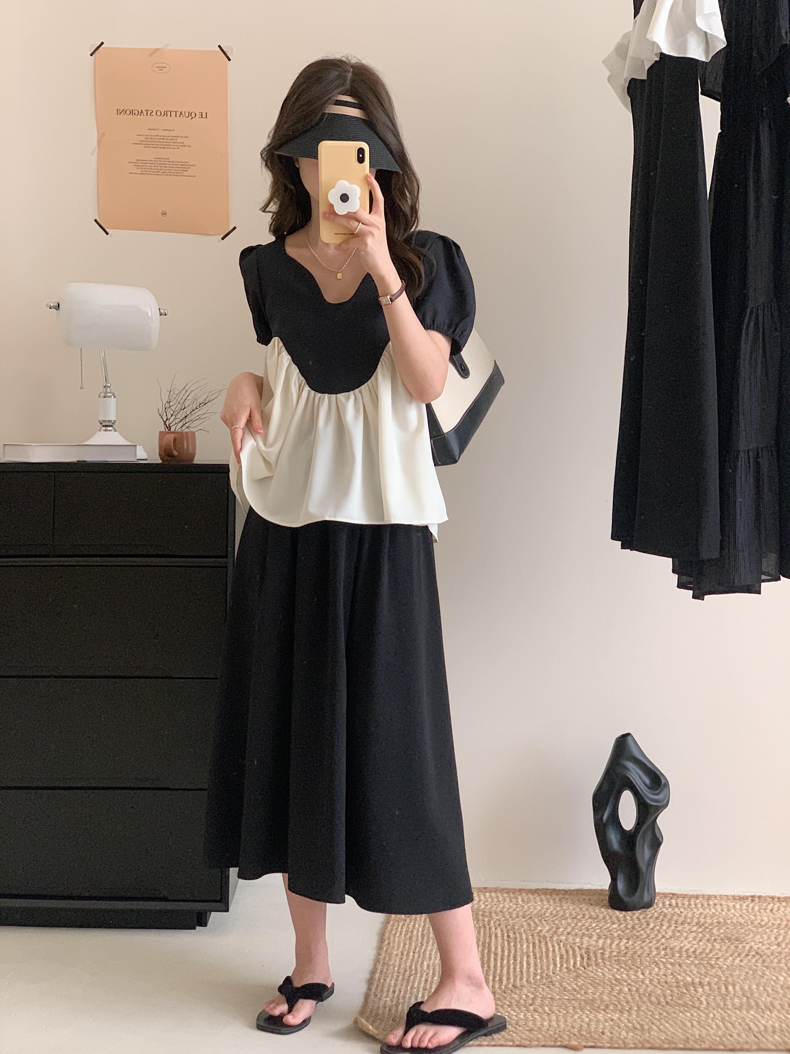 サマースタンダードVネックカラースリーブシャツ トップス レディース レトロ 夏物 ステッチ 7/20 mi4671940863930