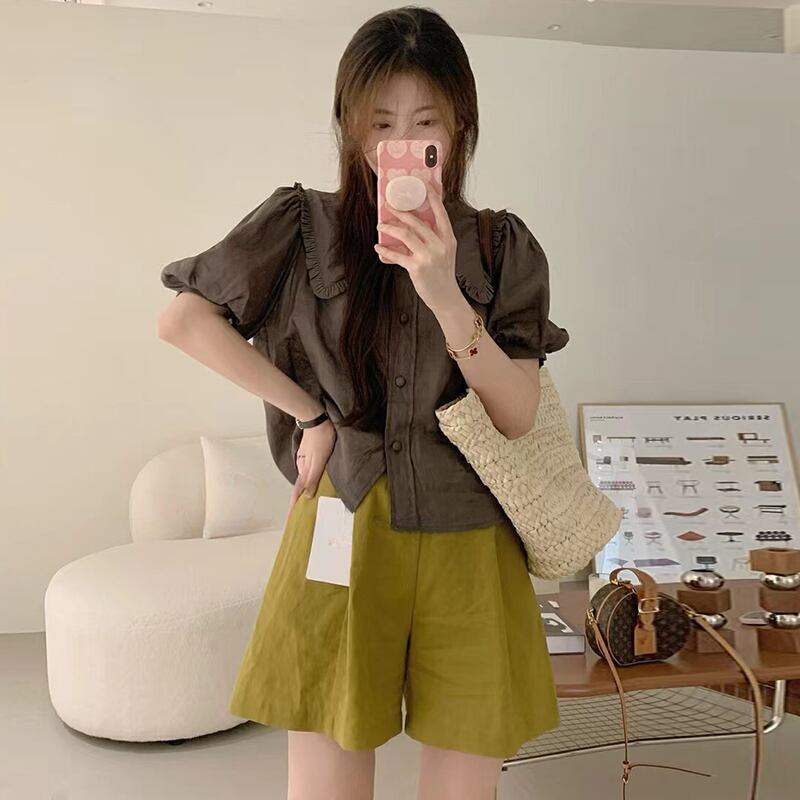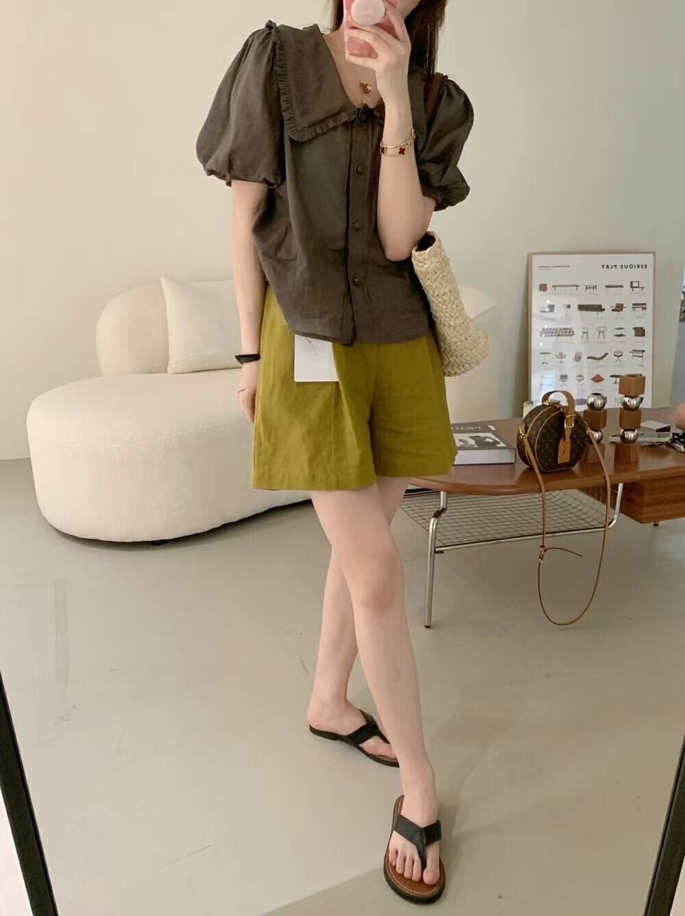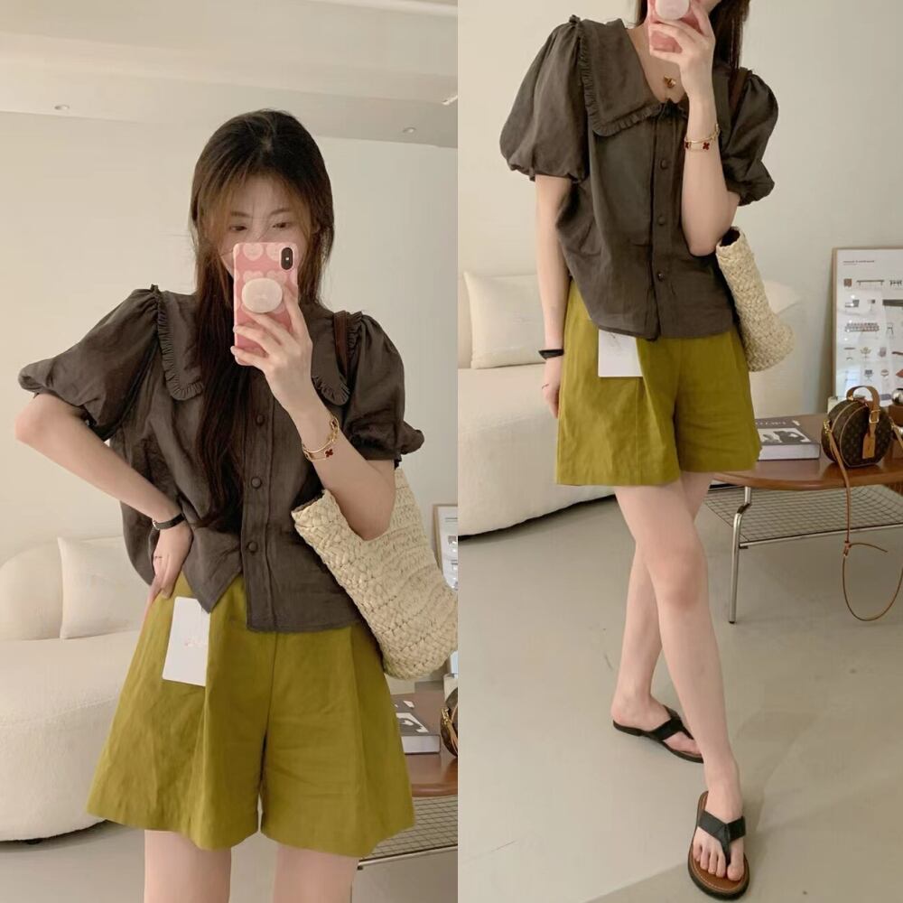 サマースタンダードスリーブシャツ ハイウェストウェスト薄手ワイドレッグパンツ ショーツ レトロ 夏物 ブルマー ワイドパンツ 7/20 mi4653949384549