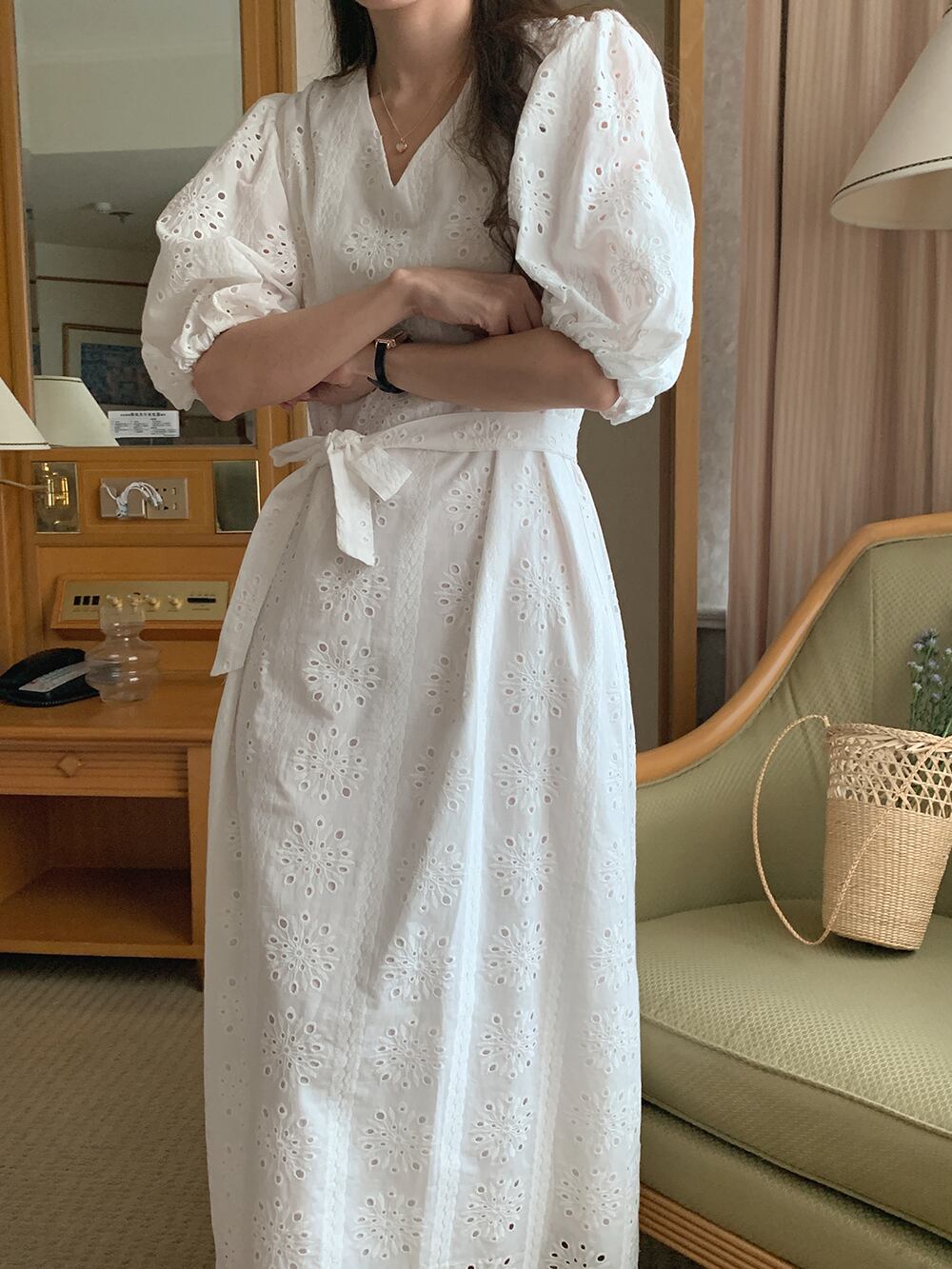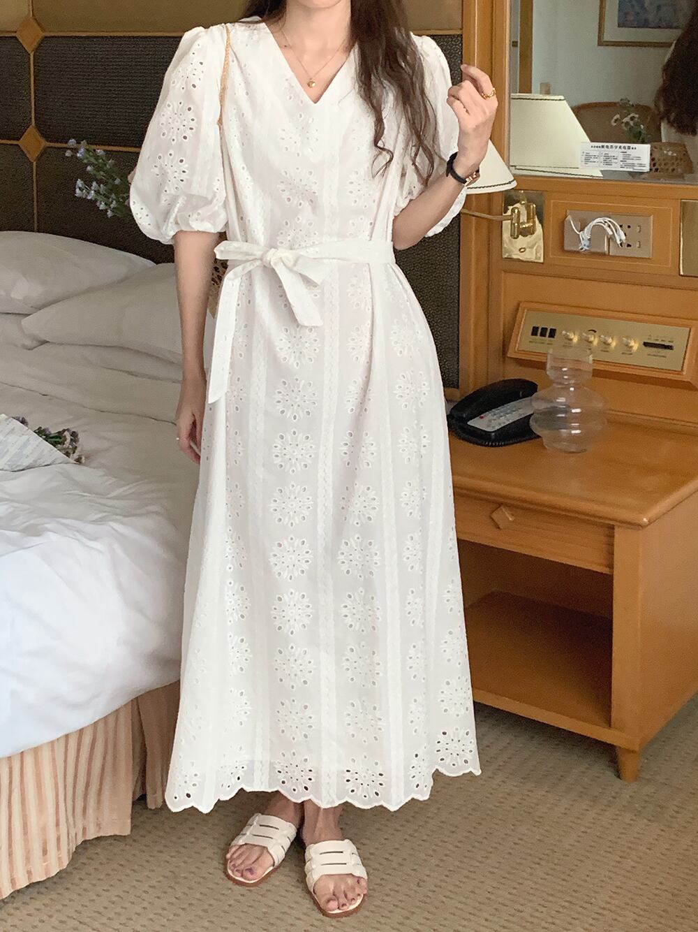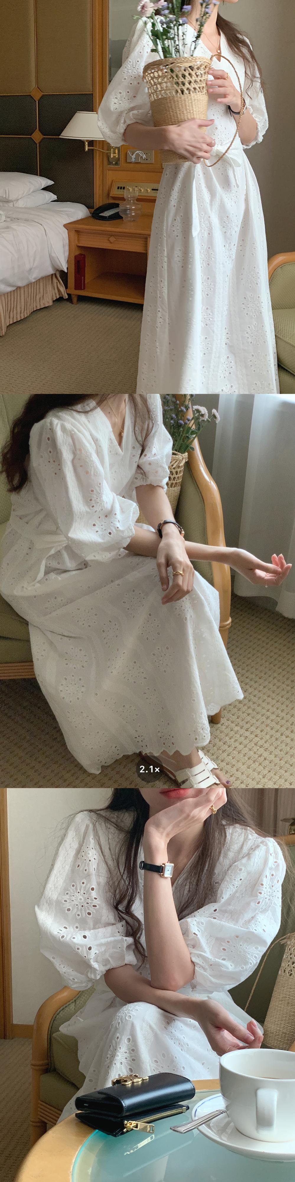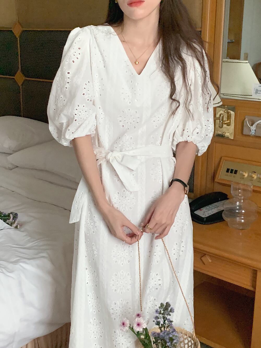 サマーVネックFlowerデザイン レースウェストスリーブロングドレス レッド 刺繍 大人ガーリー スウィート キュート カジュアル 夏物 フラワーデザイン 7/20 mi4627478456784