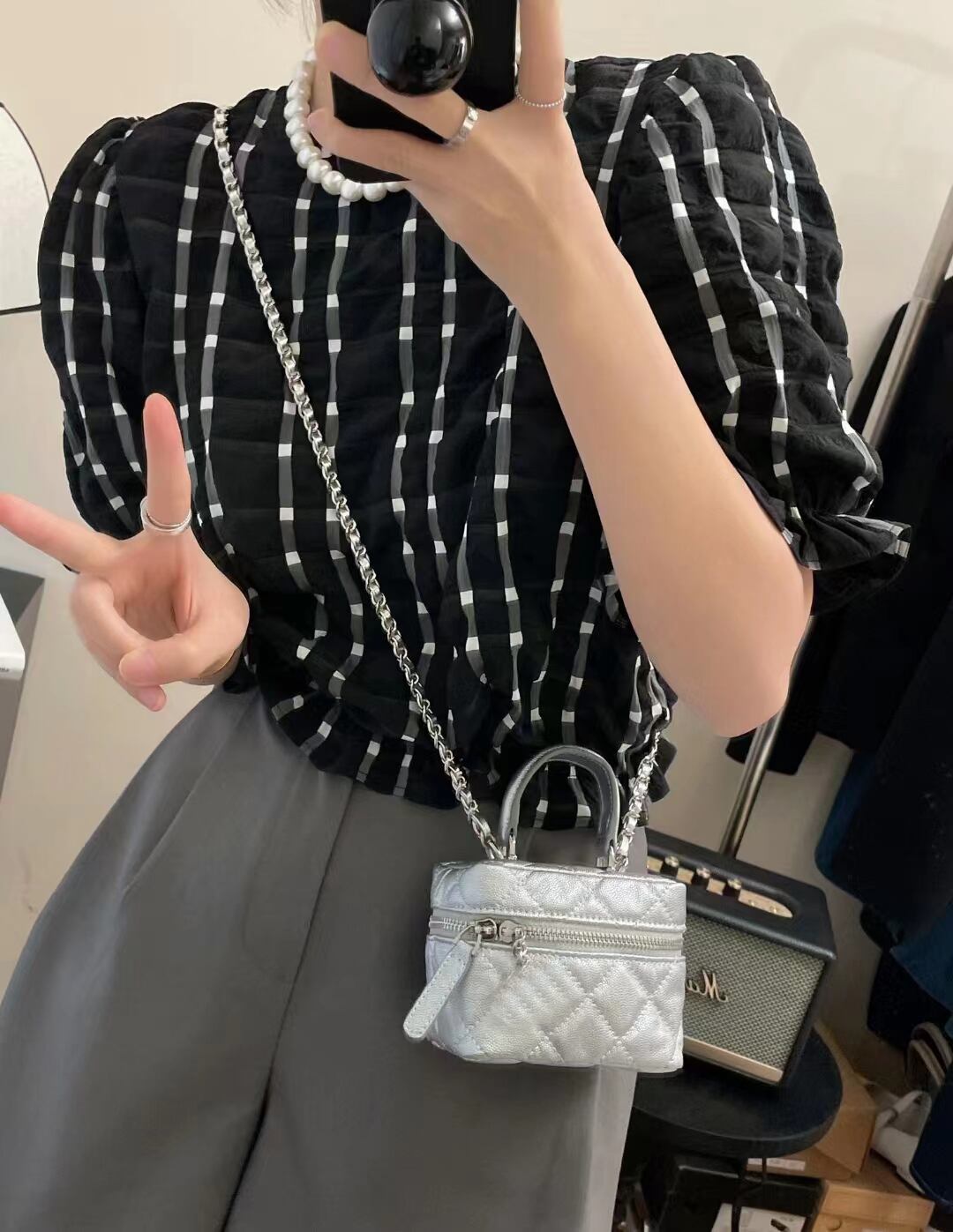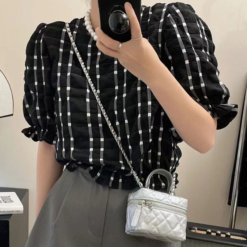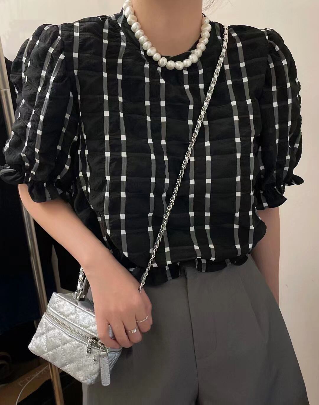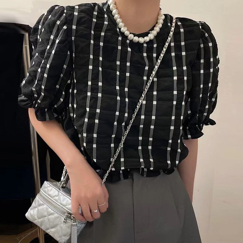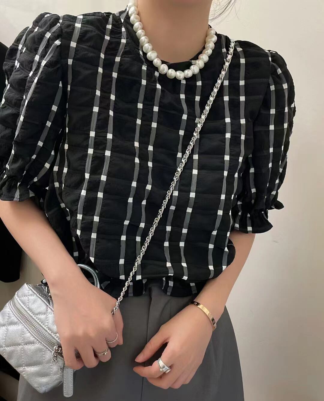 サマースタンダードスタイルラウンドネックルーズ格子柄シャツ レディース レトロ 夏物 Oネック ステッチ 7/20 mi4675461690109