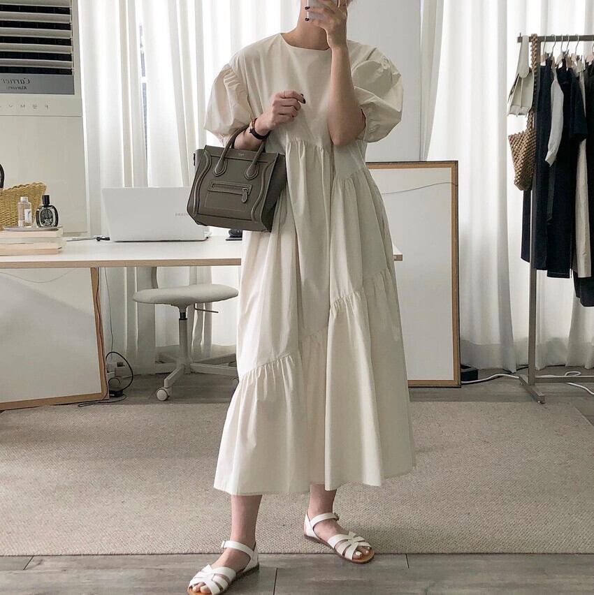 スプリングラウンドネックプリーツルーズスリーブソリッド カラードレス レッド 春物 Oネック ソリッドカラー 7/20 mi4615274284848
