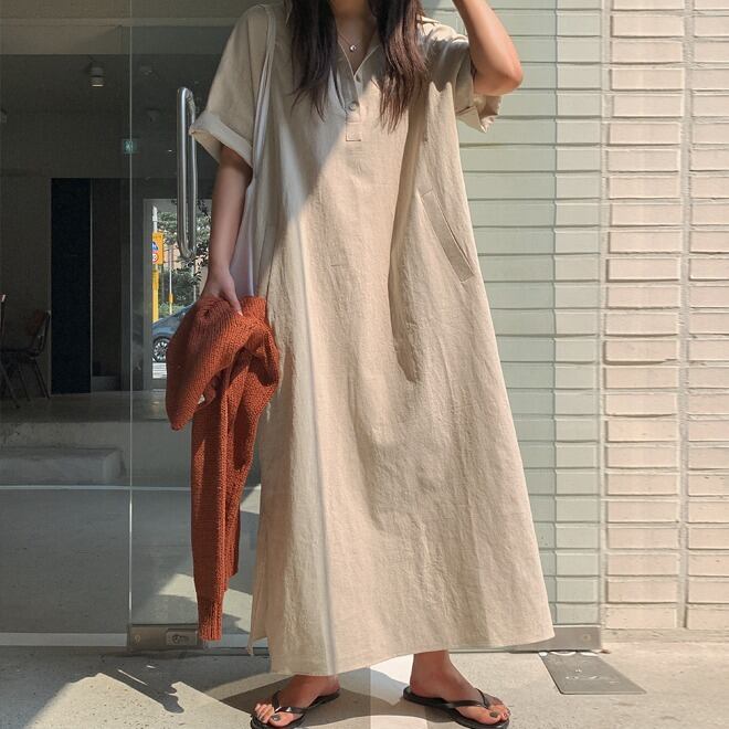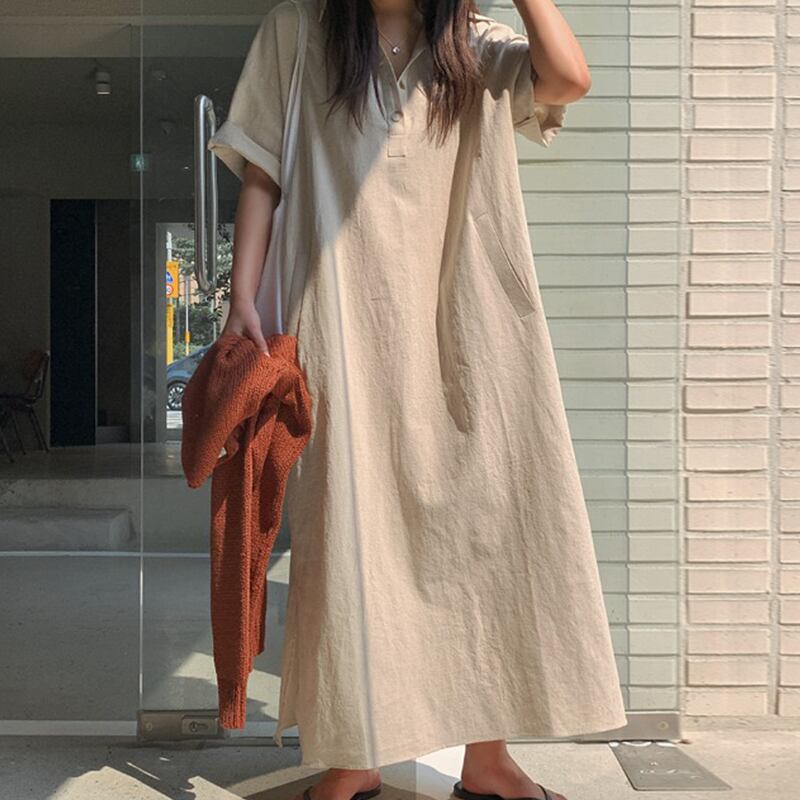 サマースタンダードカラールーズカジュアルロングサイドスリットドレス レトロ 夏物 7/20 mi4653207966559