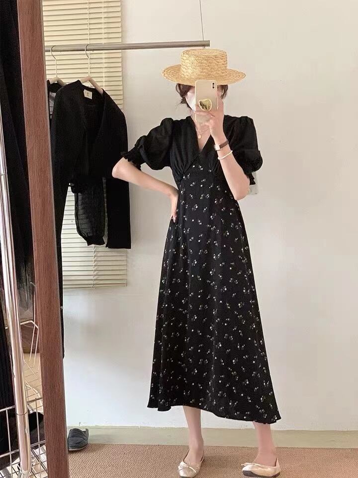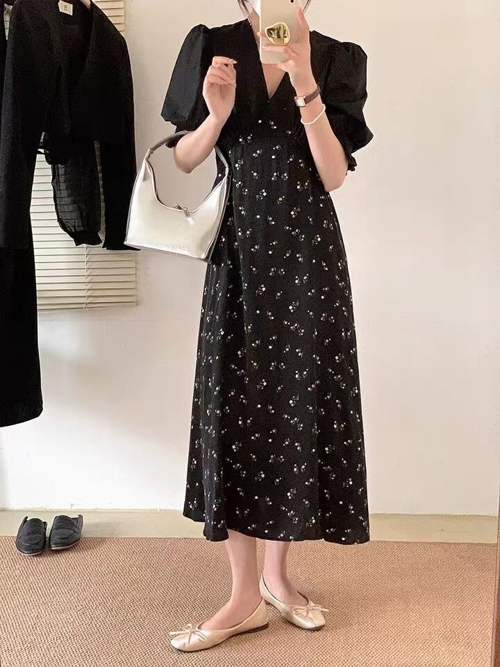 サマースタンダードVネックプリーツスリムスリーブフローラルドレス ロングスカート レトロ 夏物 花柄 7/20 mi4619085581672