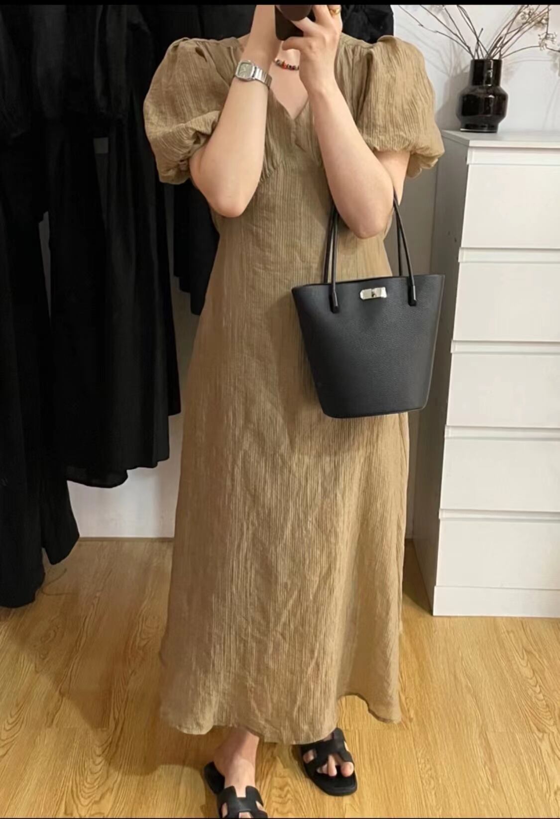 サマーVネックウェストスリムスリーブドレス ロングスカート ランタンスリーブ エレガント 夏物 7/20 mi463830153074