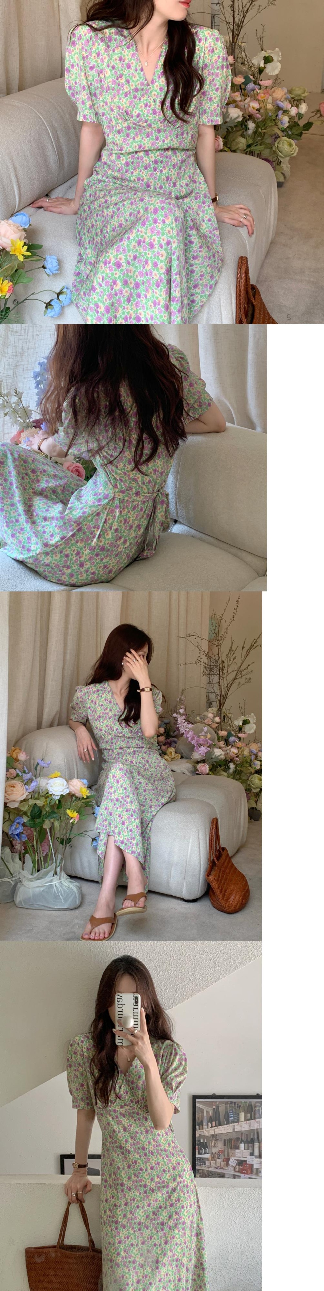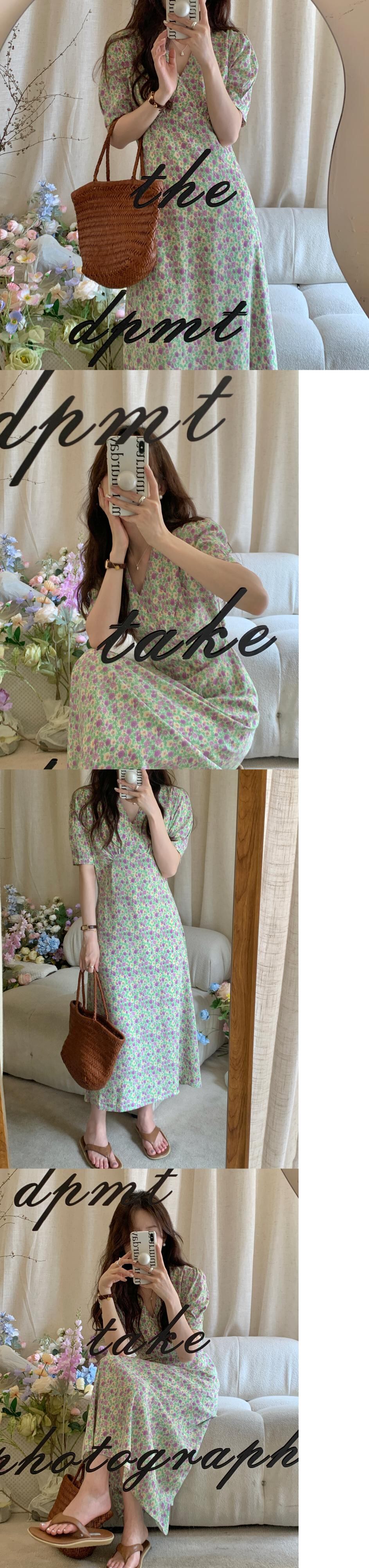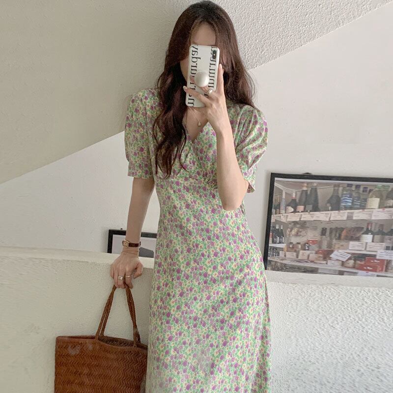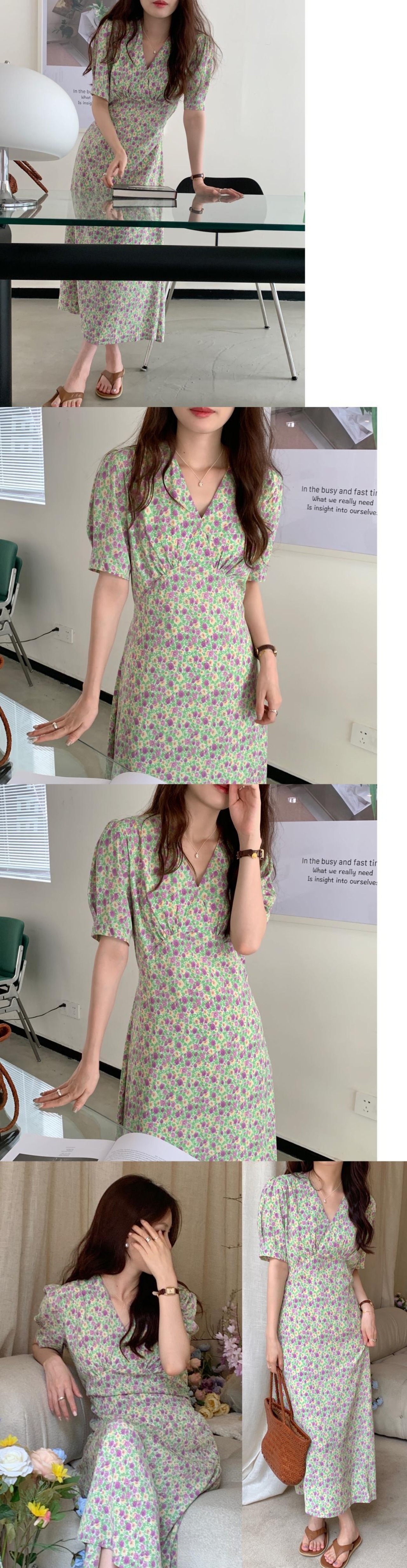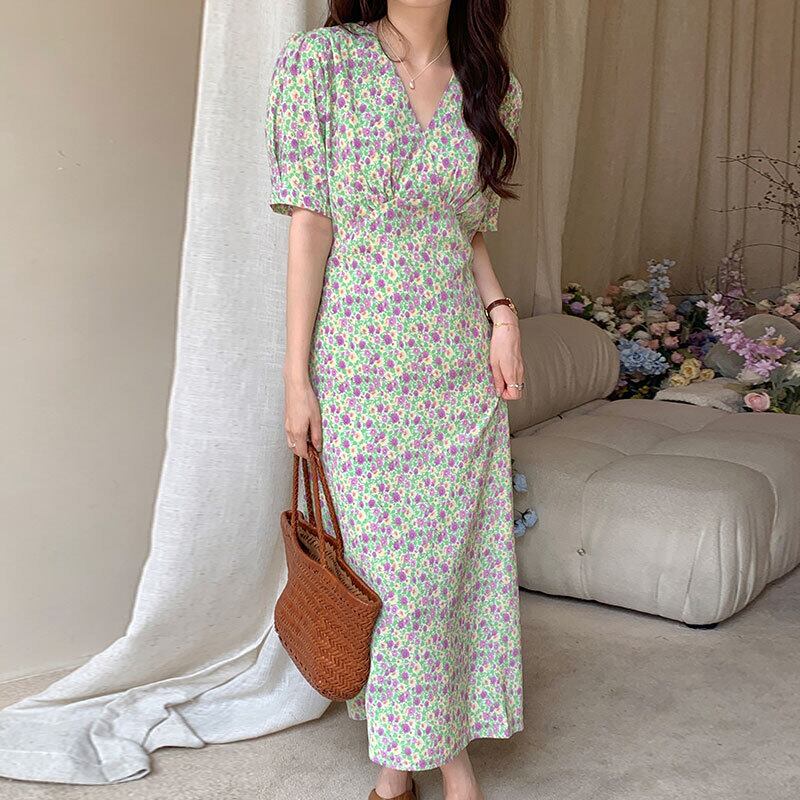 サマースタンダードVネックFlowerデザイン ウェストスリムスリーブドレス ロングスカート レトロ 夏物 フラワーデザイン 7/20 mi4671261075576