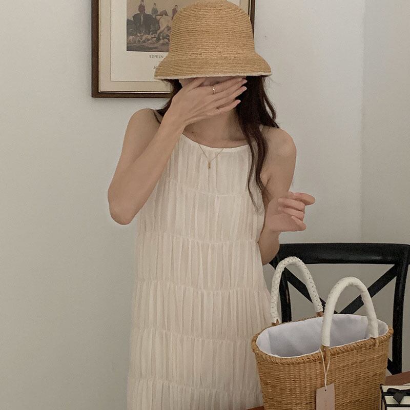 サマーラウンドネックプリーツロングノースリーブラッフルドレス レッド 長袖 夏物 Oネック 7/20 mi4676352138324