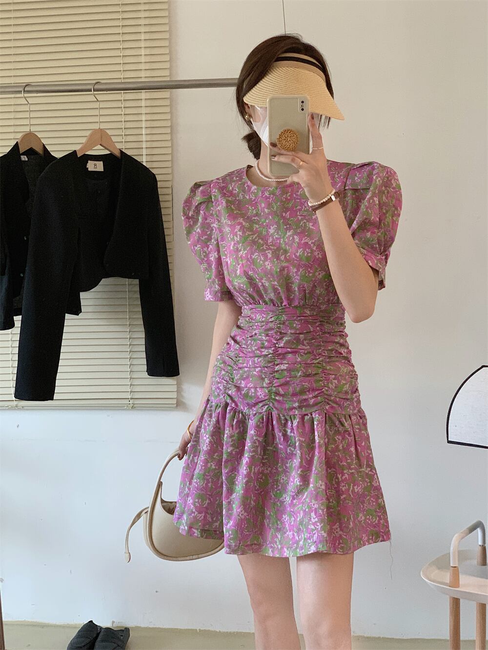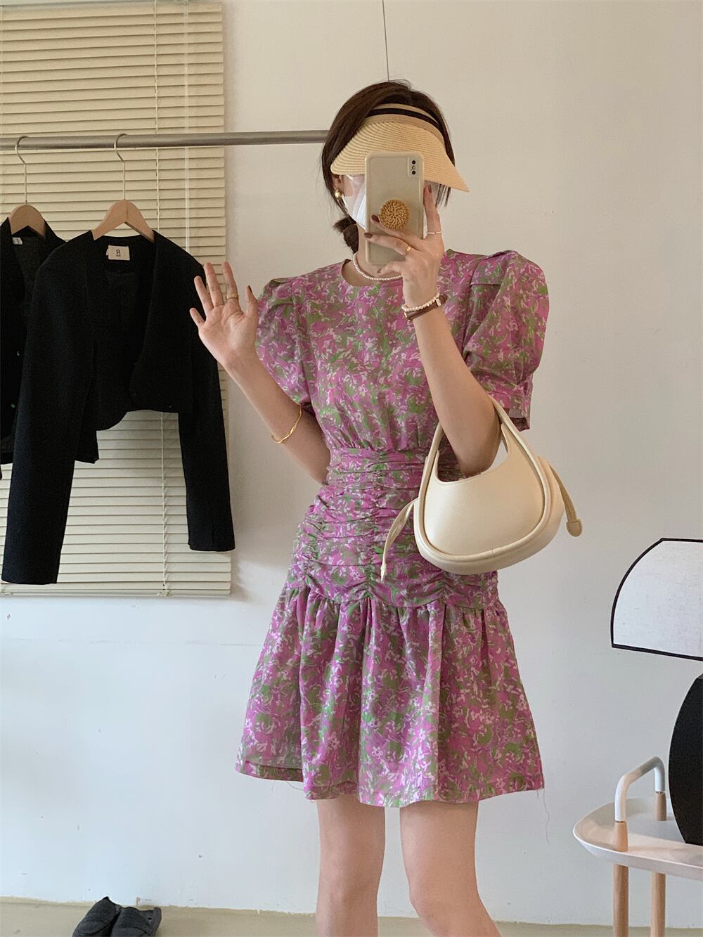 サマースタンダードラウンドネックフローラルプリント柄プリーツウェストスリムスリーブドレス レトロ 夏物 花柄 Oネック 7/20 mi4668518429977