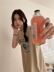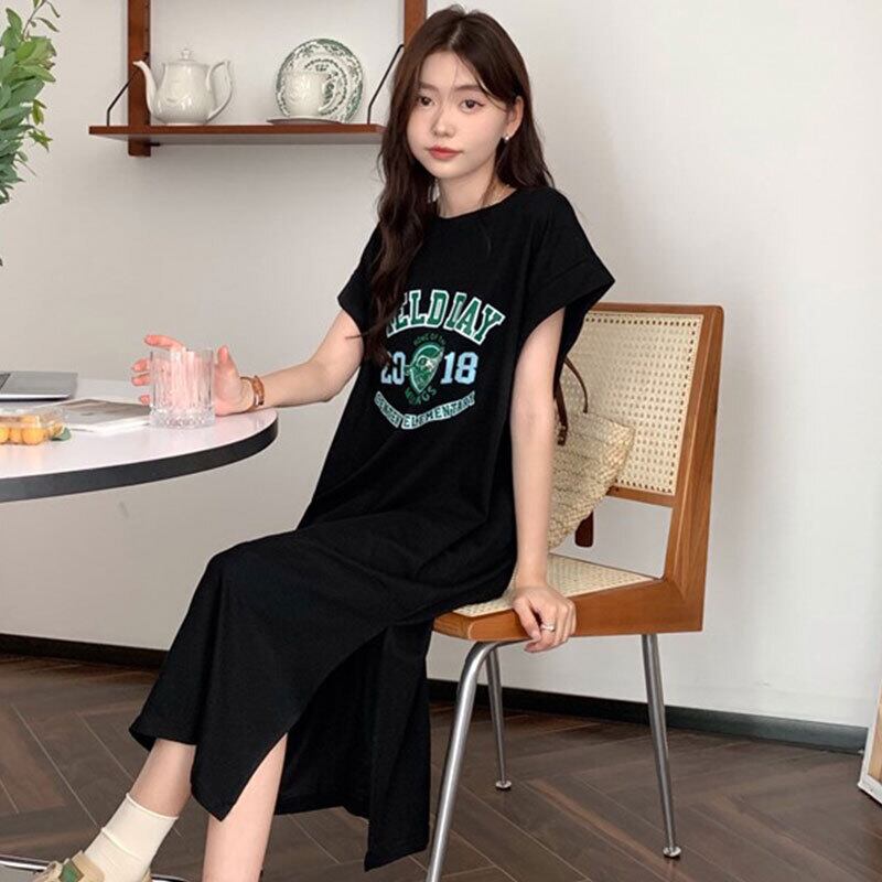 サマースタンダードプリント柄Tシャツ スカート ルーズカジュアルサイドスリットドレス レディース レトロ 夏物 7/20 mi4655774593435