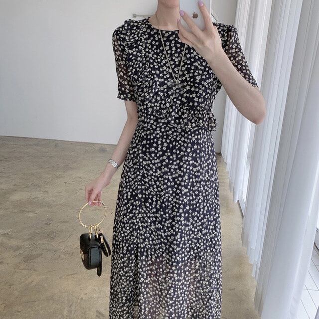 サマースタンダードラウンドネックプリーツギャザーウェストフローラルドレス レトロ 夏物 花柄 Oネック ステッチ 7/20 mi4642207842727