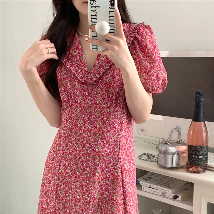 サマースタンダードサイドウェストスリムスリーブフローラルドレス ロングスカート レトロ 夏物 花柄 7/20 mi4654449522671