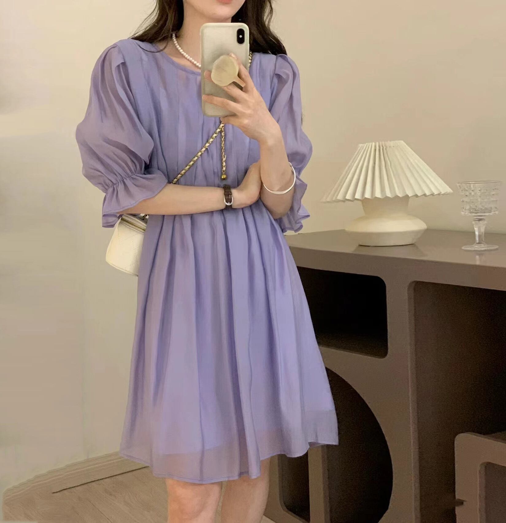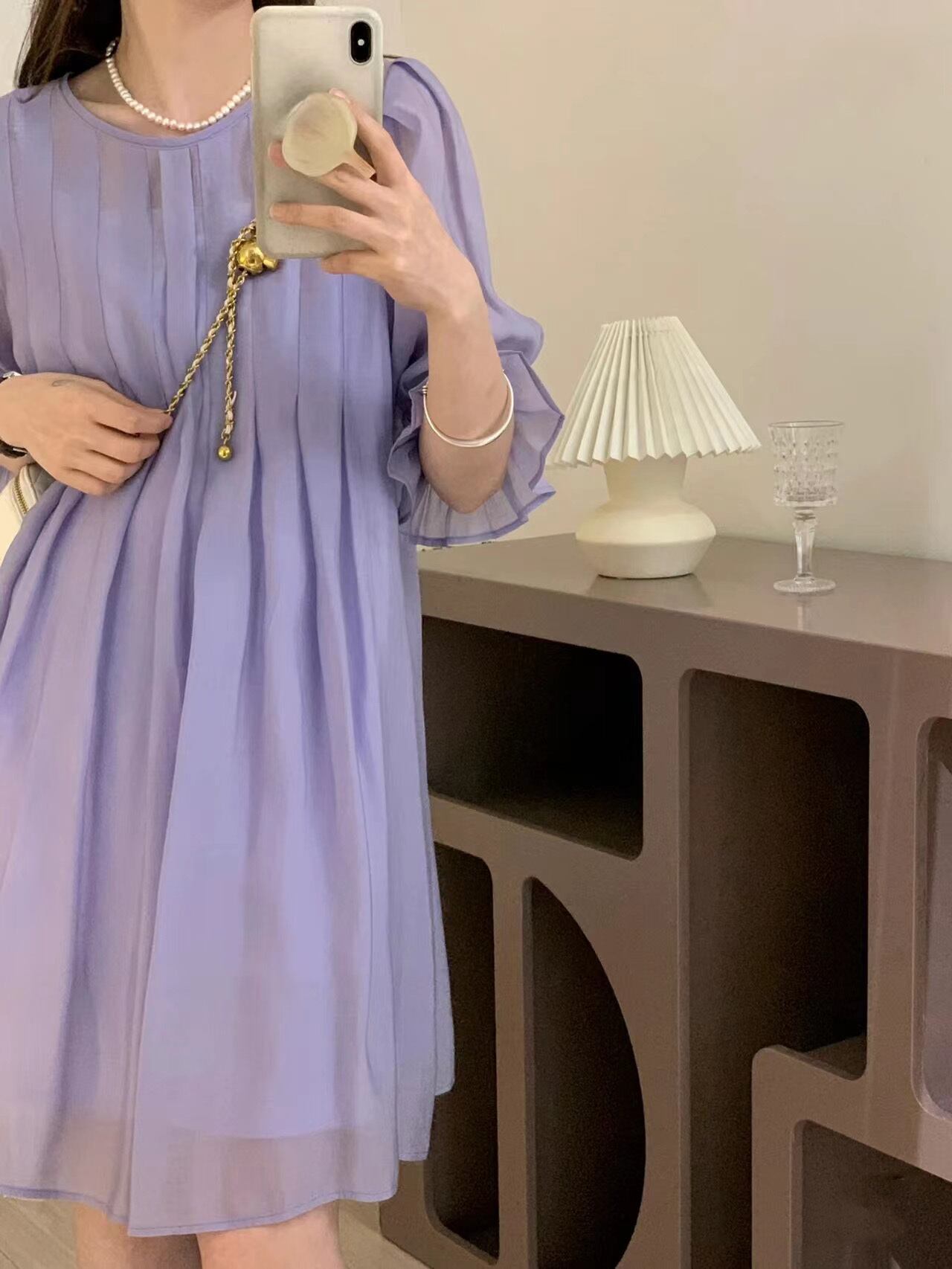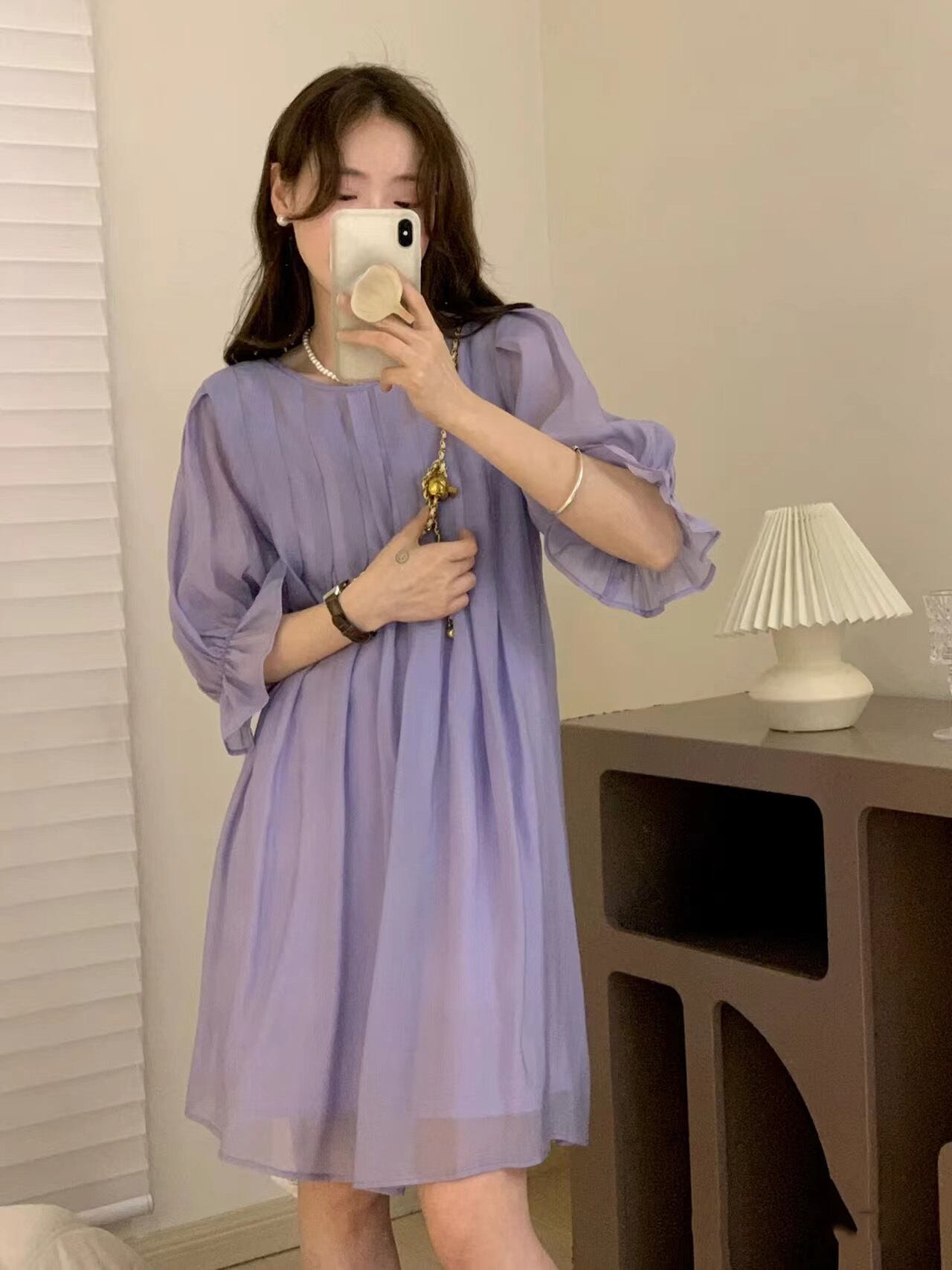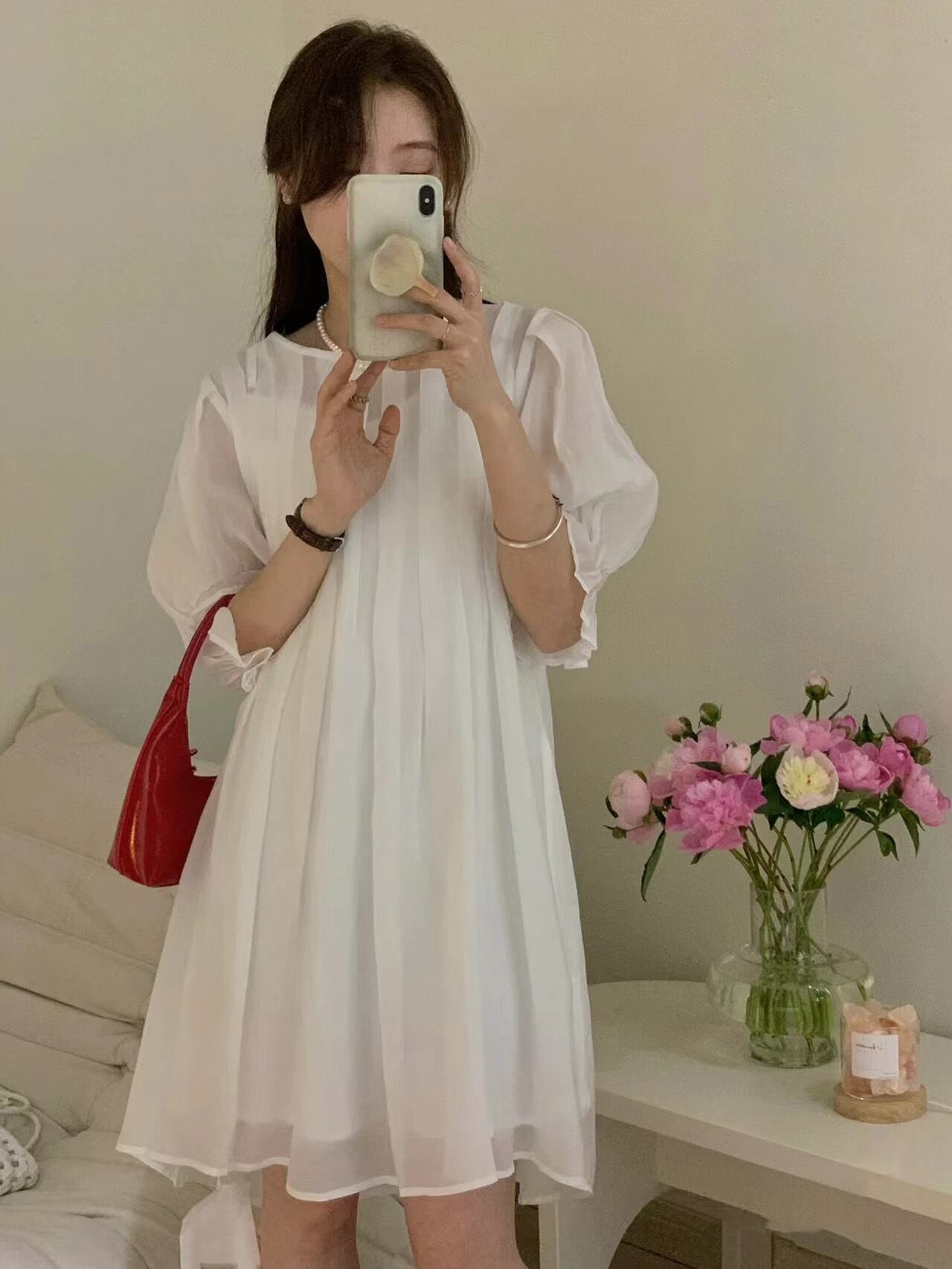 サマーラウンドネックプリーツウェスト薄手スリーブドレス ショートスカート 夏物 Oネック 7/20 mi4676188968001