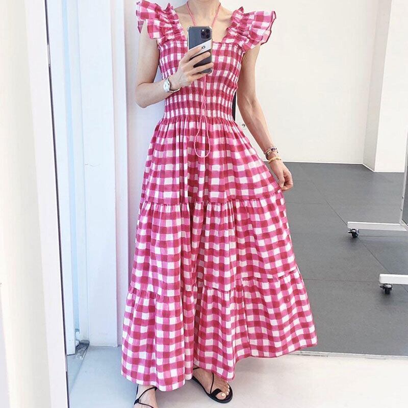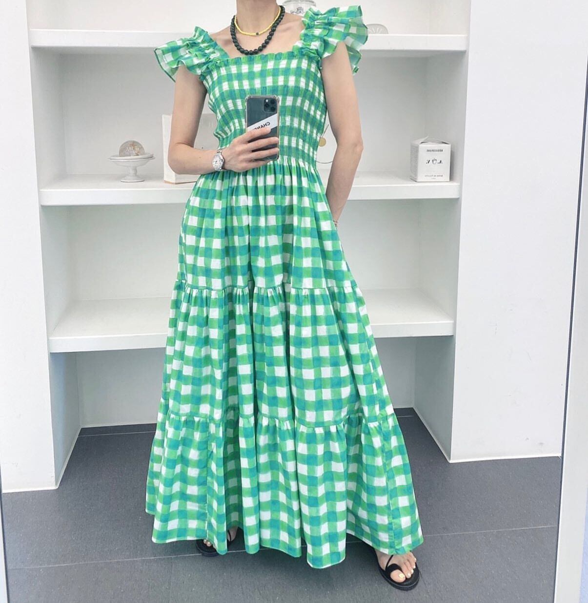 サマープリーツウェスト格子柄ドレス エレガント 夏物 スクウェア 7/20 mi4645550678809