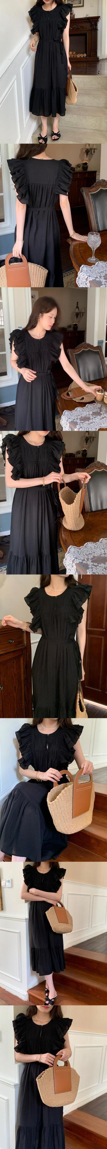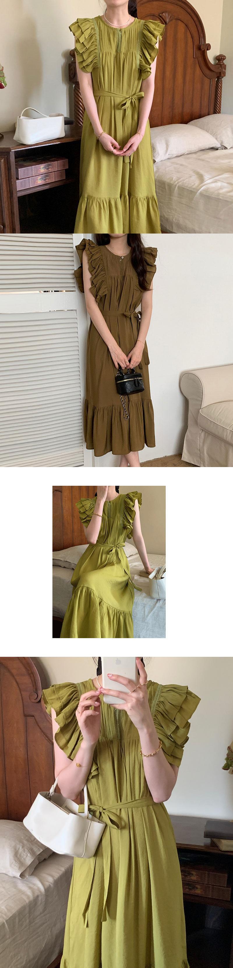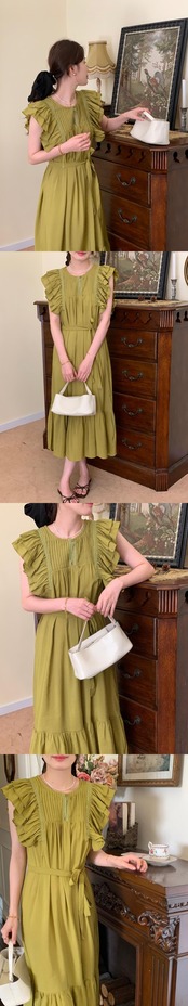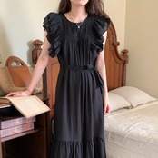 スタンダードラウンドネックプリーツレースウェストスリーブドレス レトロ Oネック ステッチ 7/20 mi4636353408202