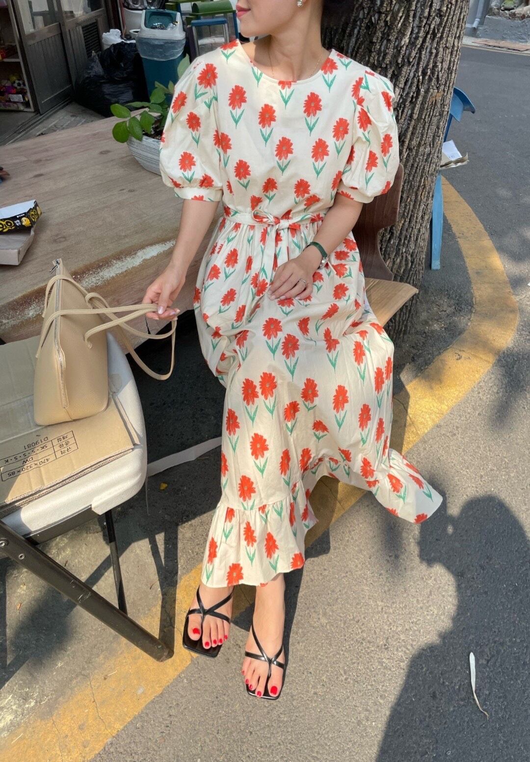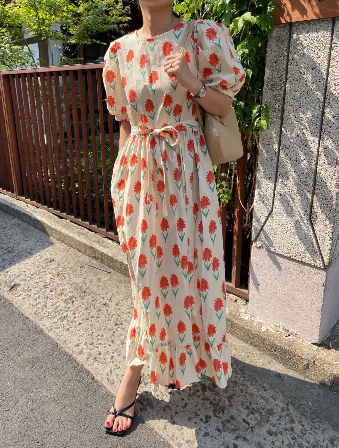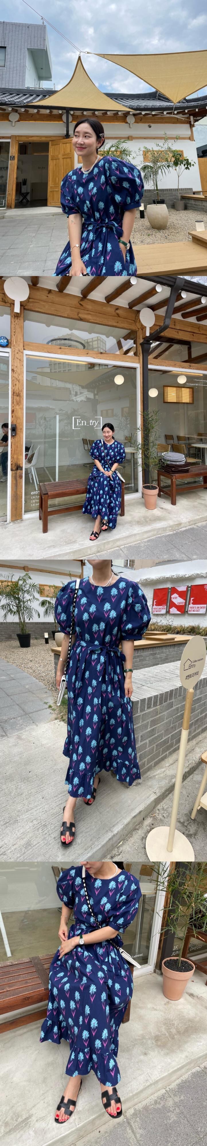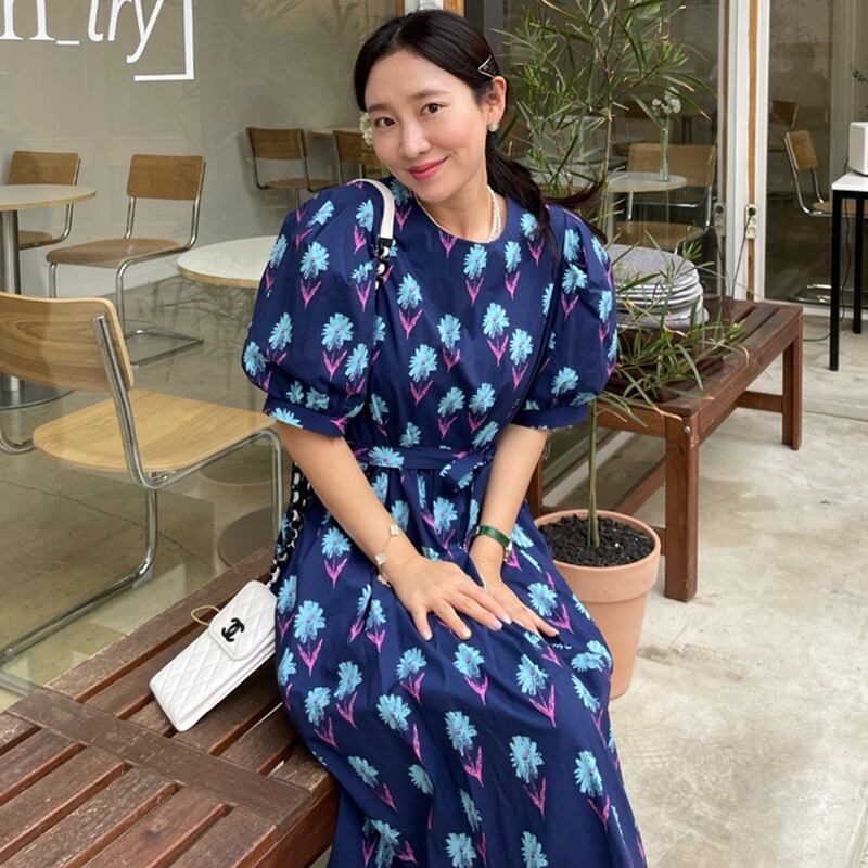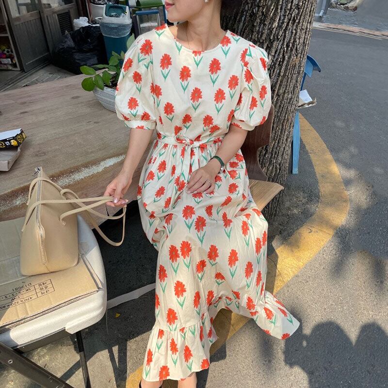 サマースタンダードラウンドネックFlowerデザイン ウェストロングスリーブドレス レトロ 夏物 Oネック フラワーデザイン 7/20 mi4645155836894
