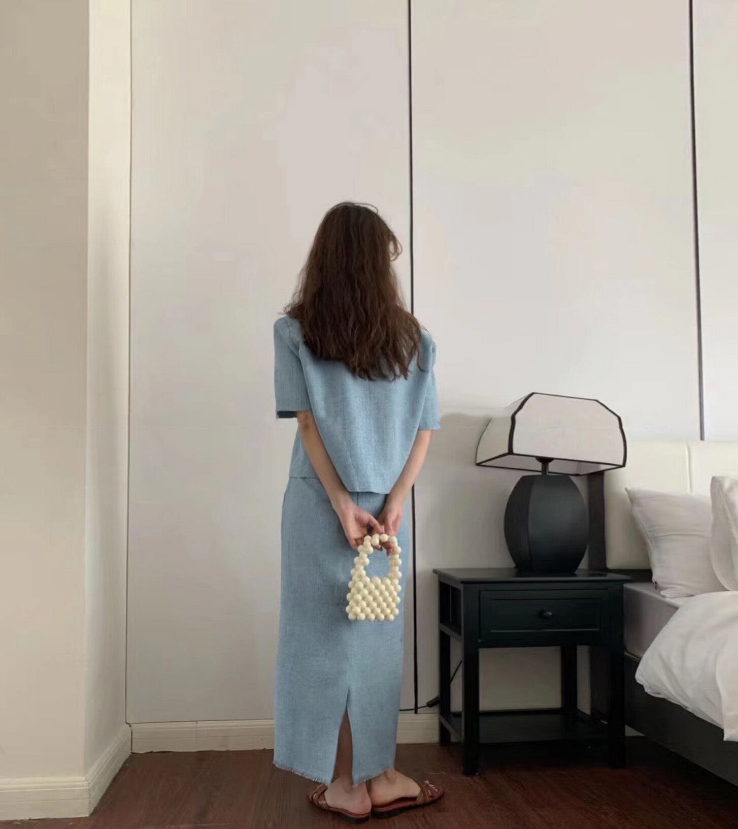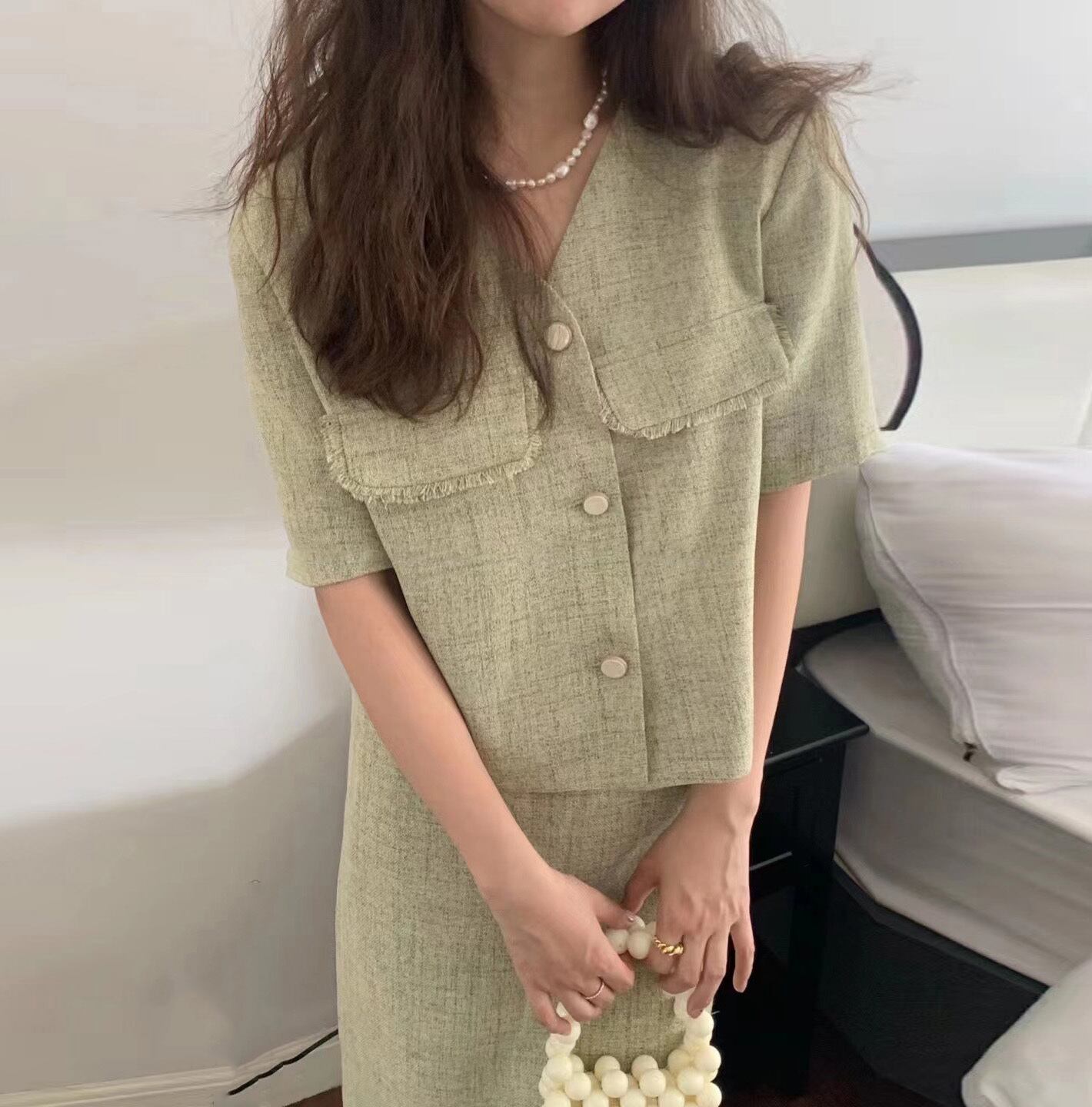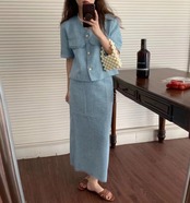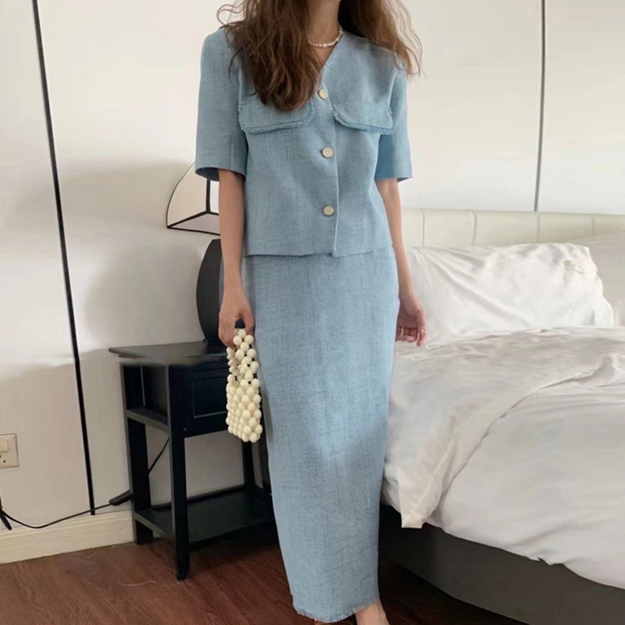 サマーVネックツィードショートコート ハイウェストウェストロングスカート レディース 夏物 7/20 mi4618860093444