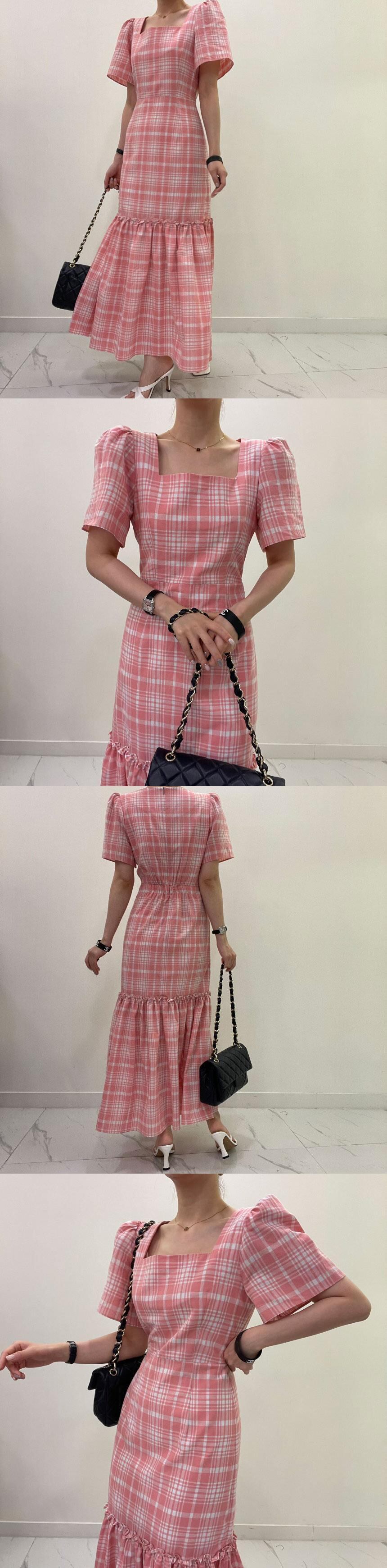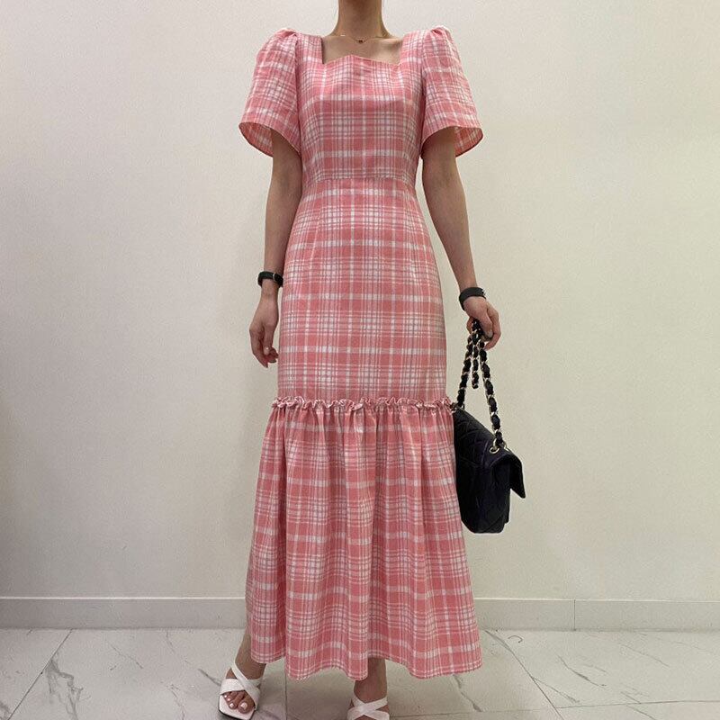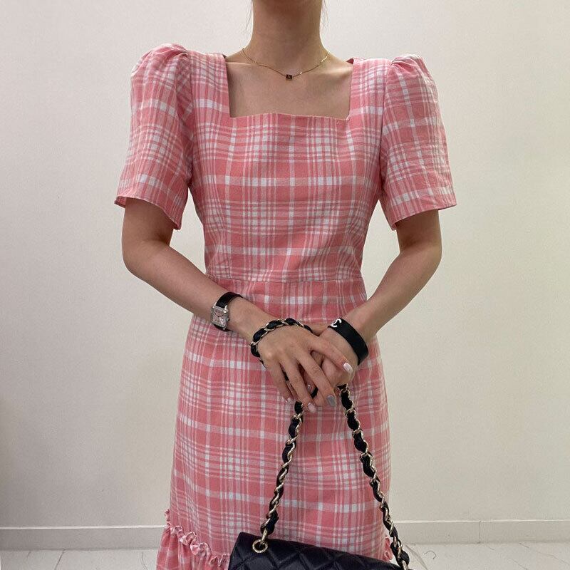 サマースタンダードウェストスリムスリーブ格子柄ドレス レトロ エレガント 夏物 スクウェア ステッチ 7/20 mi4620306492429