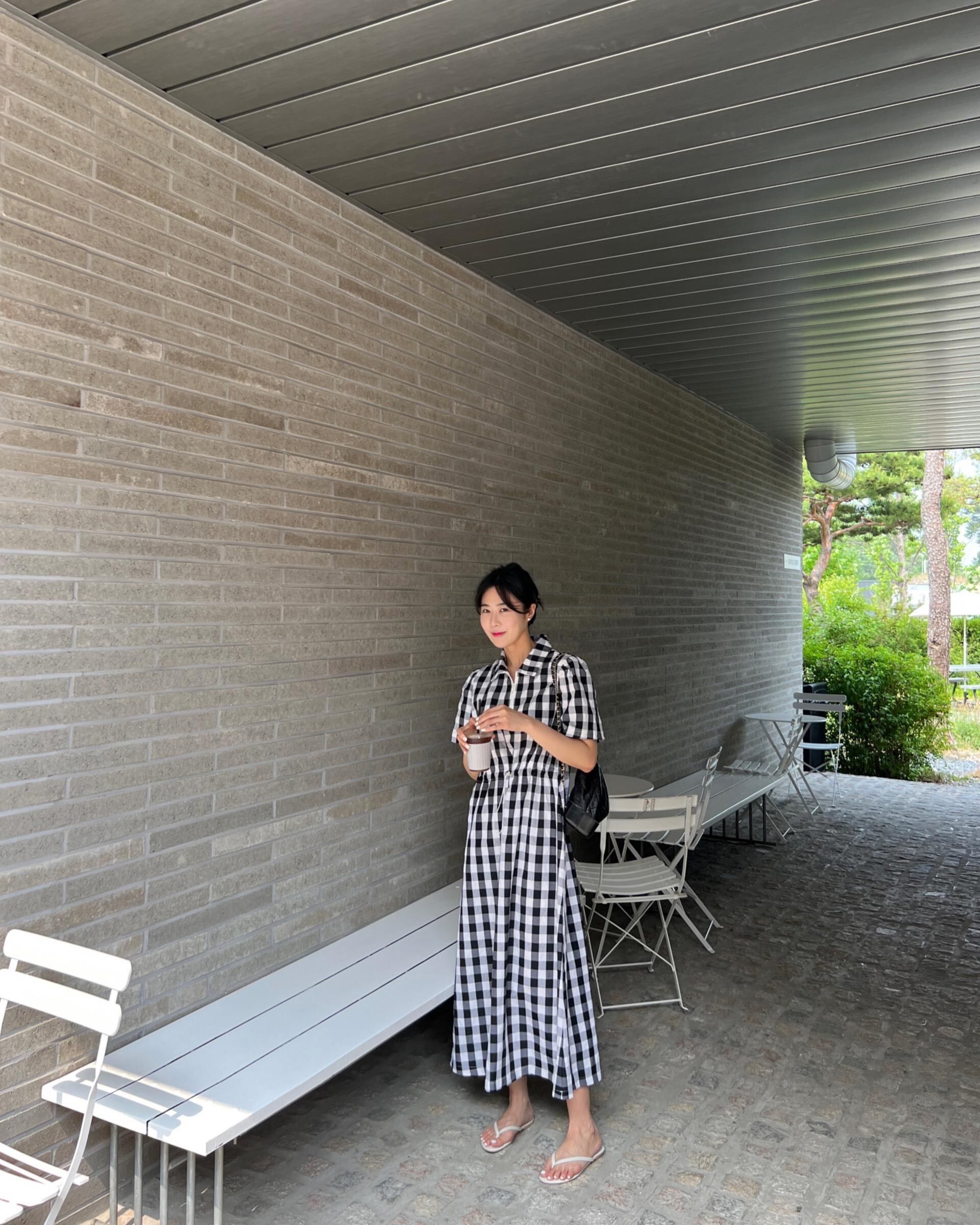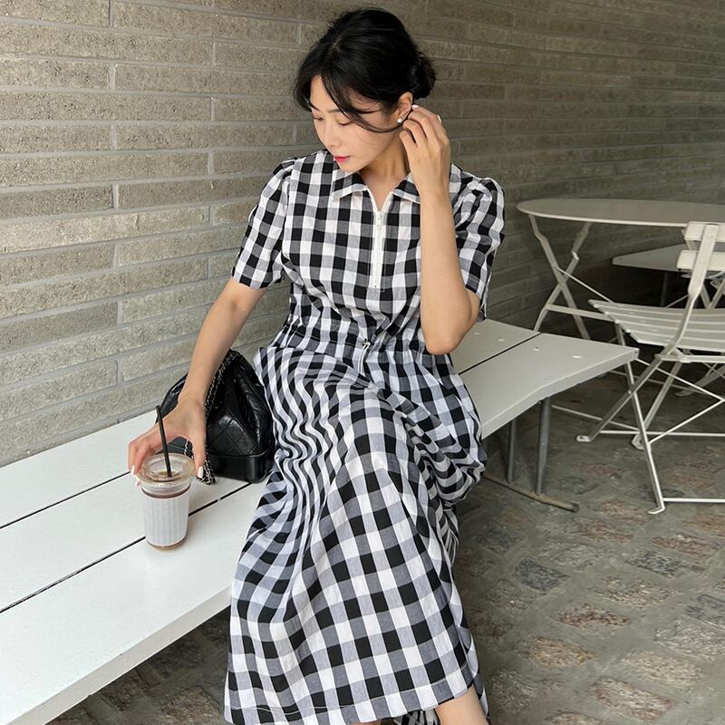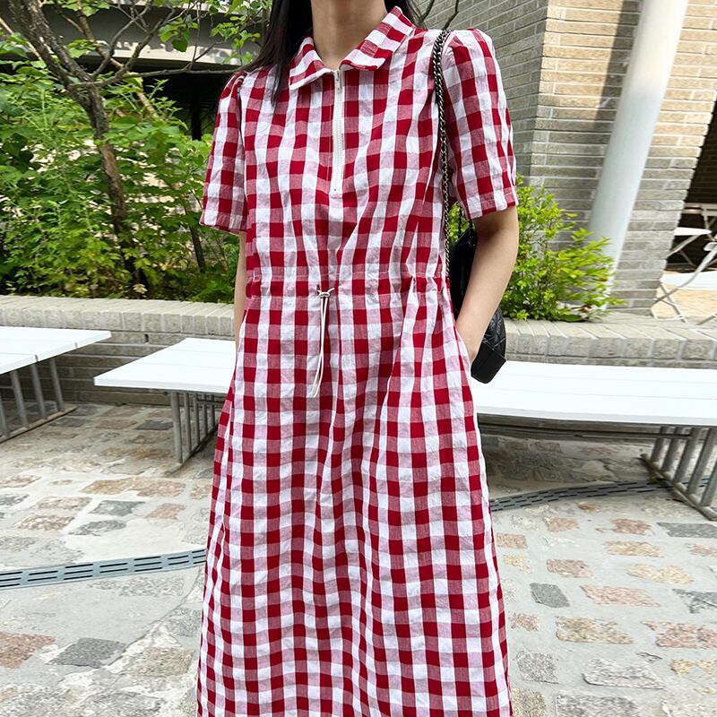 サマースタンダードスタイルギャザーウェスト薄手格子柄ドレス ロングスカート レトロ 夏物 7/20 mi4665949443693