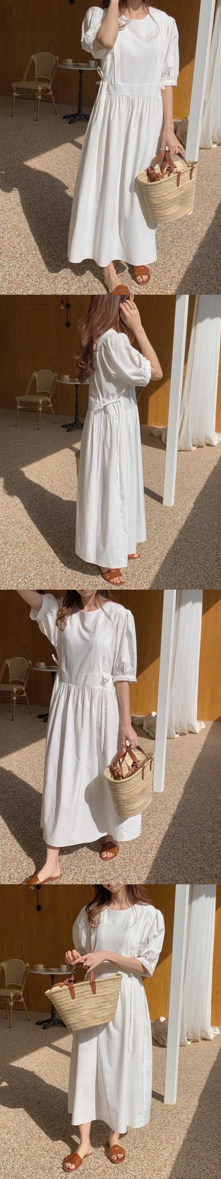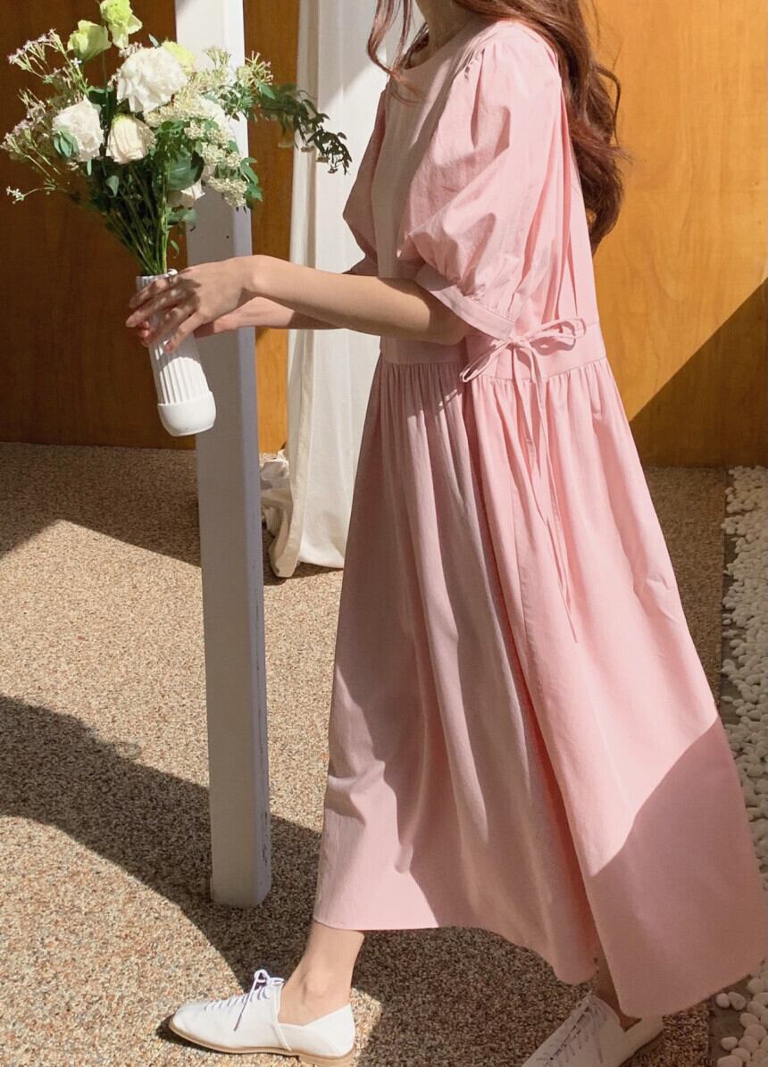 ラウンドネックサイドウェストプリーツスリーブドレス ロングスカート レディース Oネック ステッチ 7/20 mi4634855656044