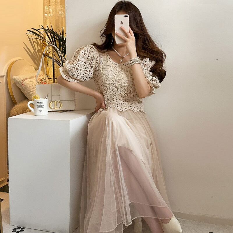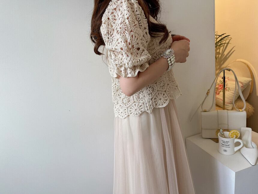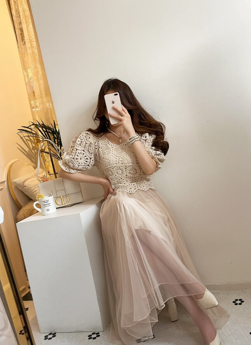 サマーVネックレースシャツ メッシュドレス エレガント 夏物 ステッチ 7/20 mi4676248272030