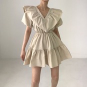 サマーVネックプリーツウェスト薄手スリーブドレス レディース 夏物 ステッチ 7/20 mi4678695267704
