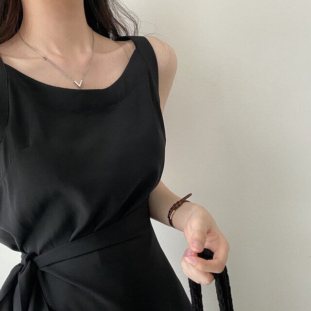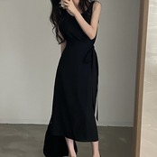 サマーラウンドネックバンドウェストスリムノースリーブロングドレス ブラック 夏物 Oネック 7/20 mi4665968882677